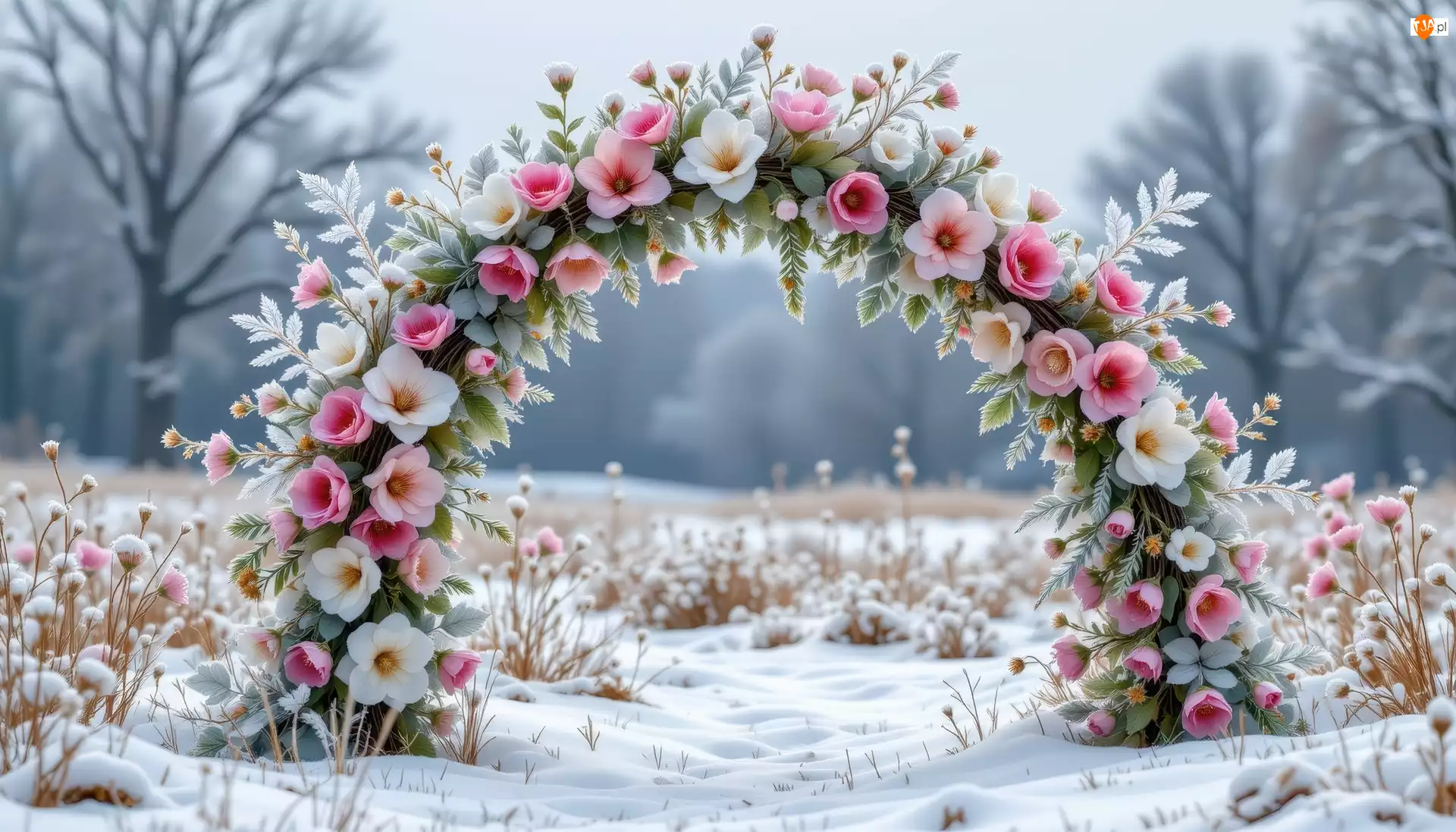 Łuk, Zima, Roślinność, Śnieg, Kwiaty, Drzewa