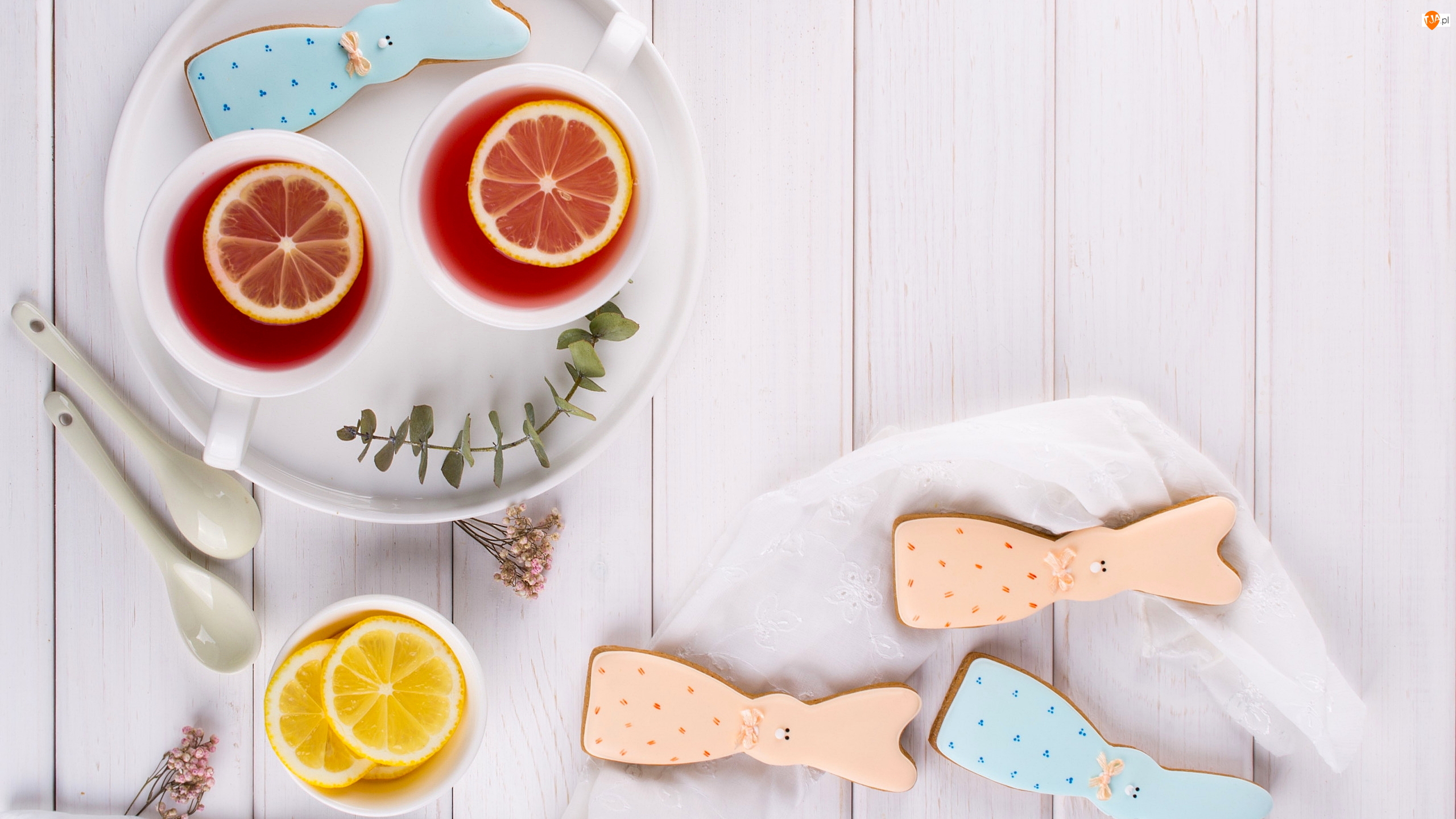 Ciasteczka, Herbata, Cytryna, Zajączki, Dwa, Lukrowane, Deski, Kubki