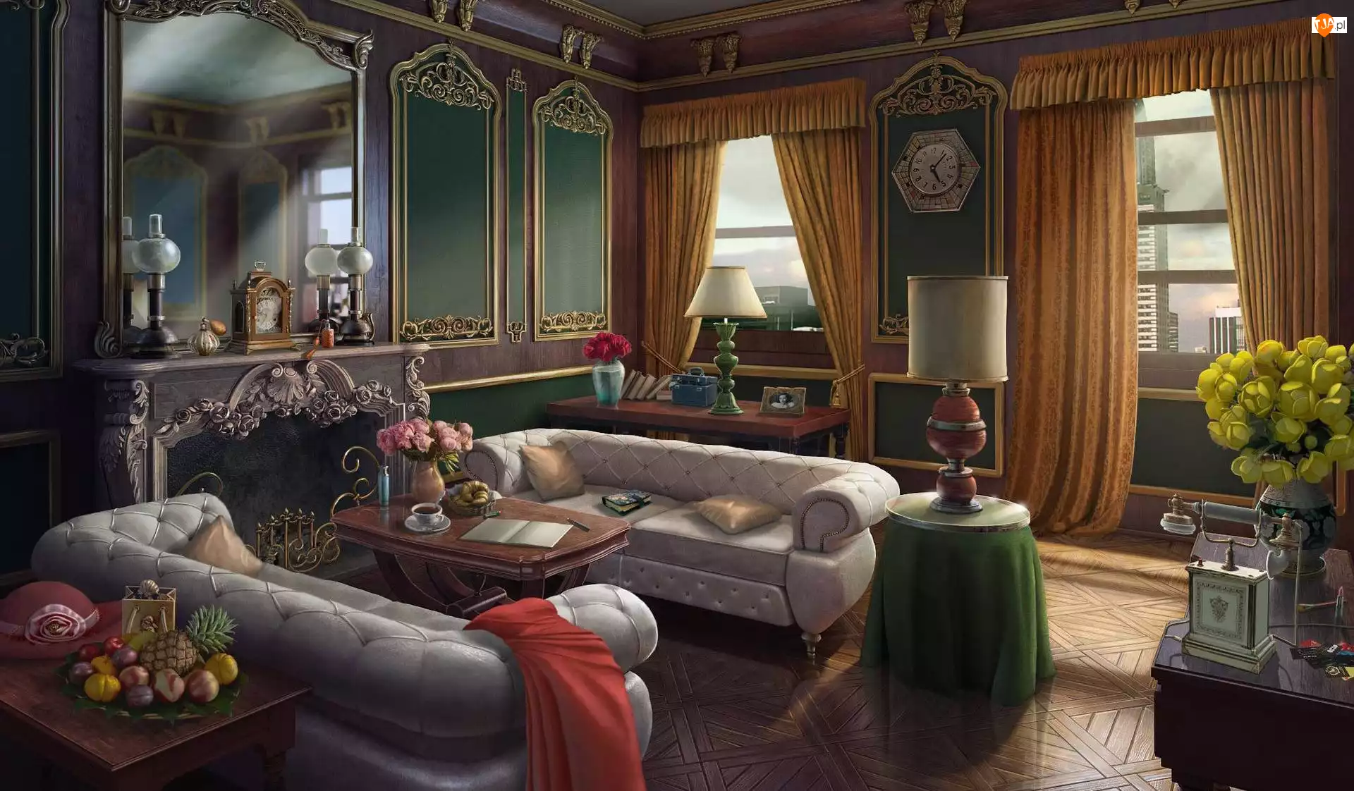 Kanapy, Stolik, Kominek, Pokój, Kwiaty, Lampy, Lustro