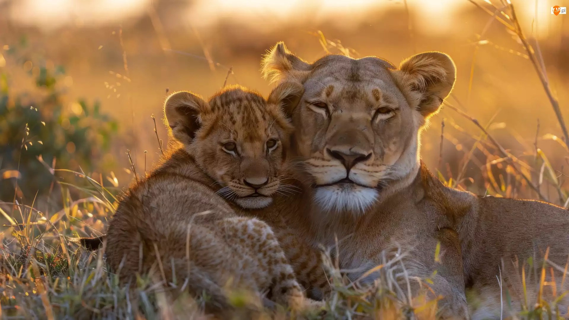 Lwica, Lwy, Lew, Grafika, Mały, Trawa