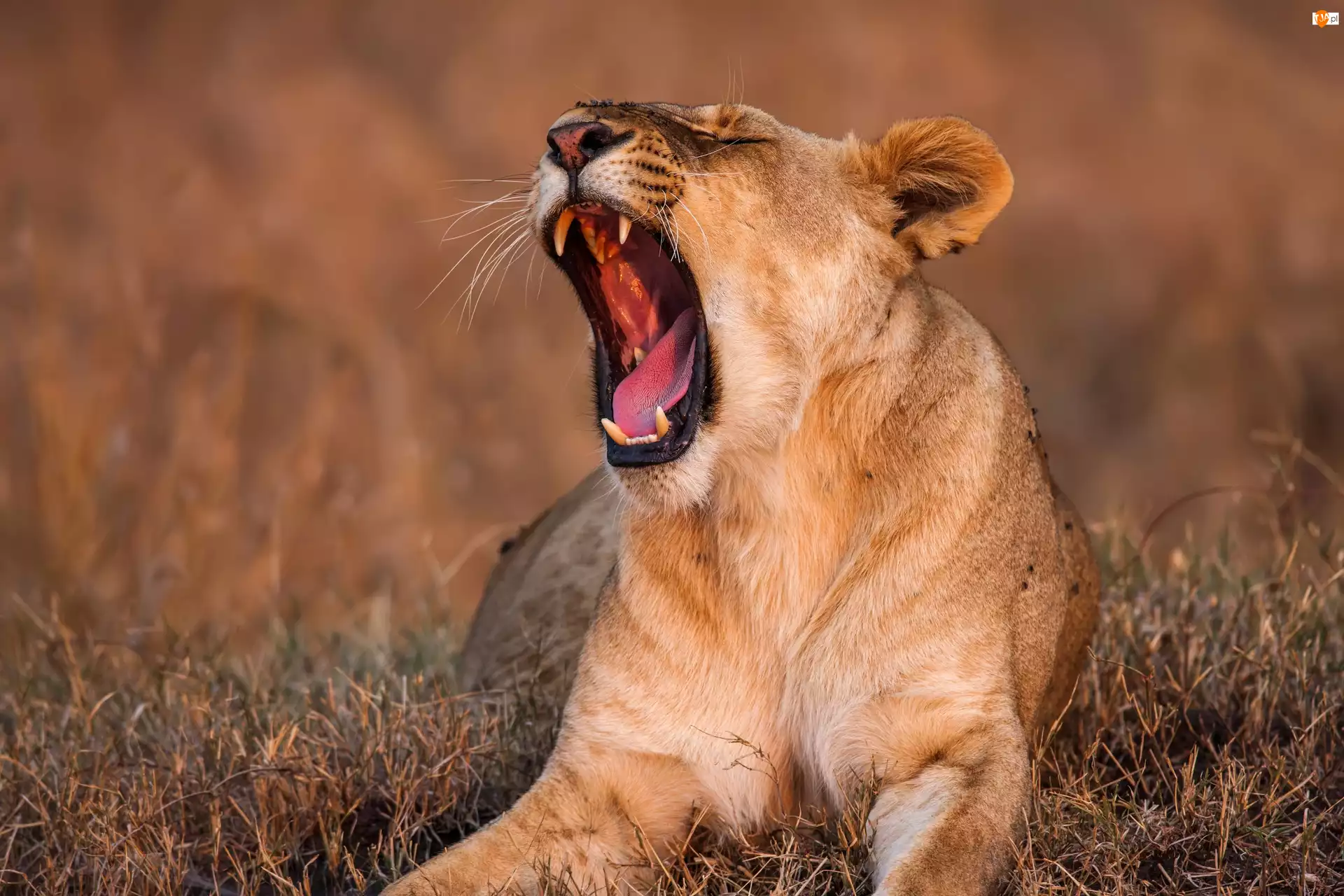 Lwica ziewa na trawie