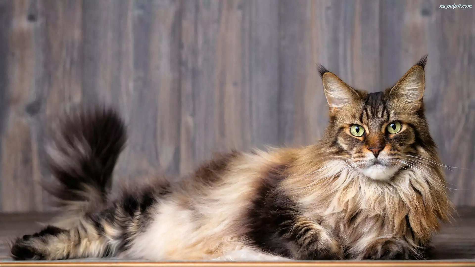 Maine coon, Ogon, Kot, Leżący, Uniesiony