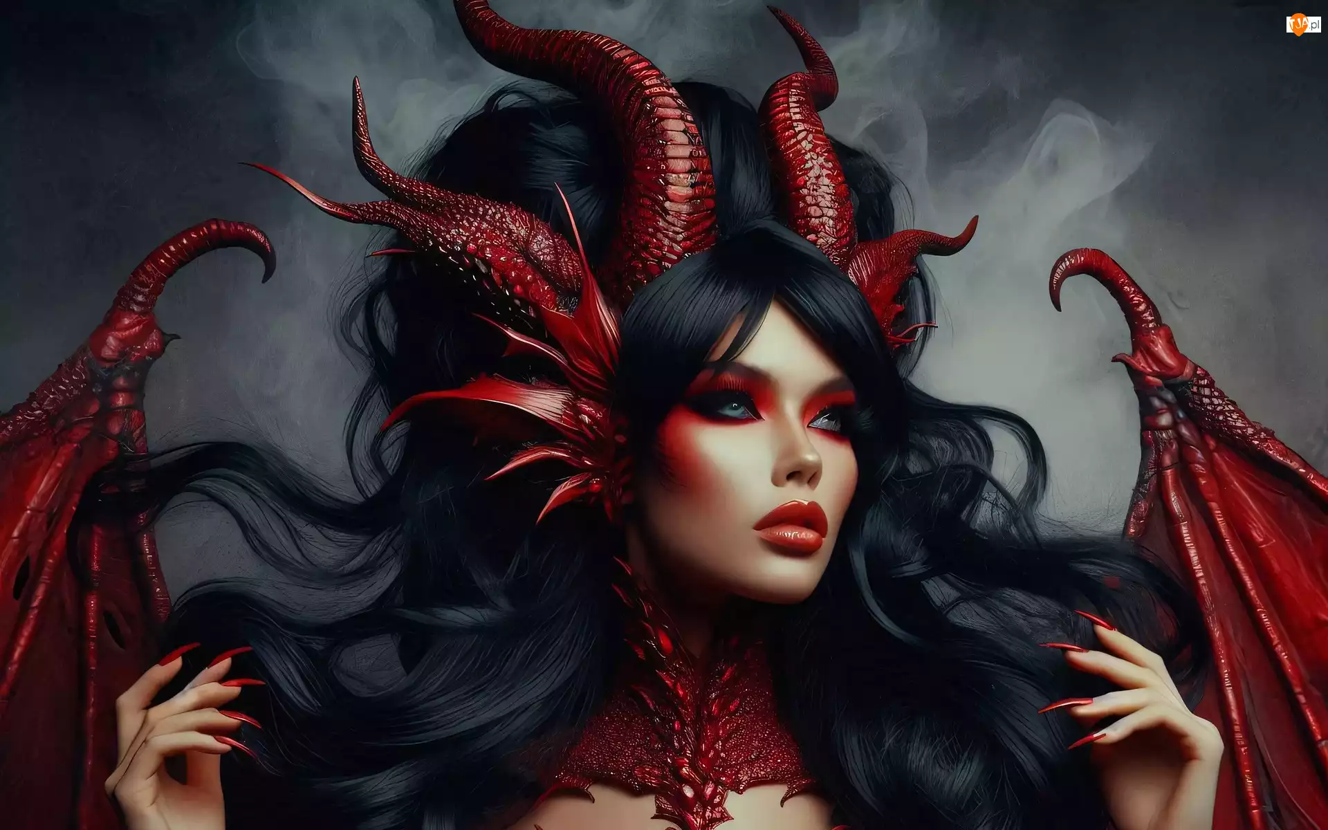 Makijaż, Grafika, Brunetka, Kobieta, Rogi