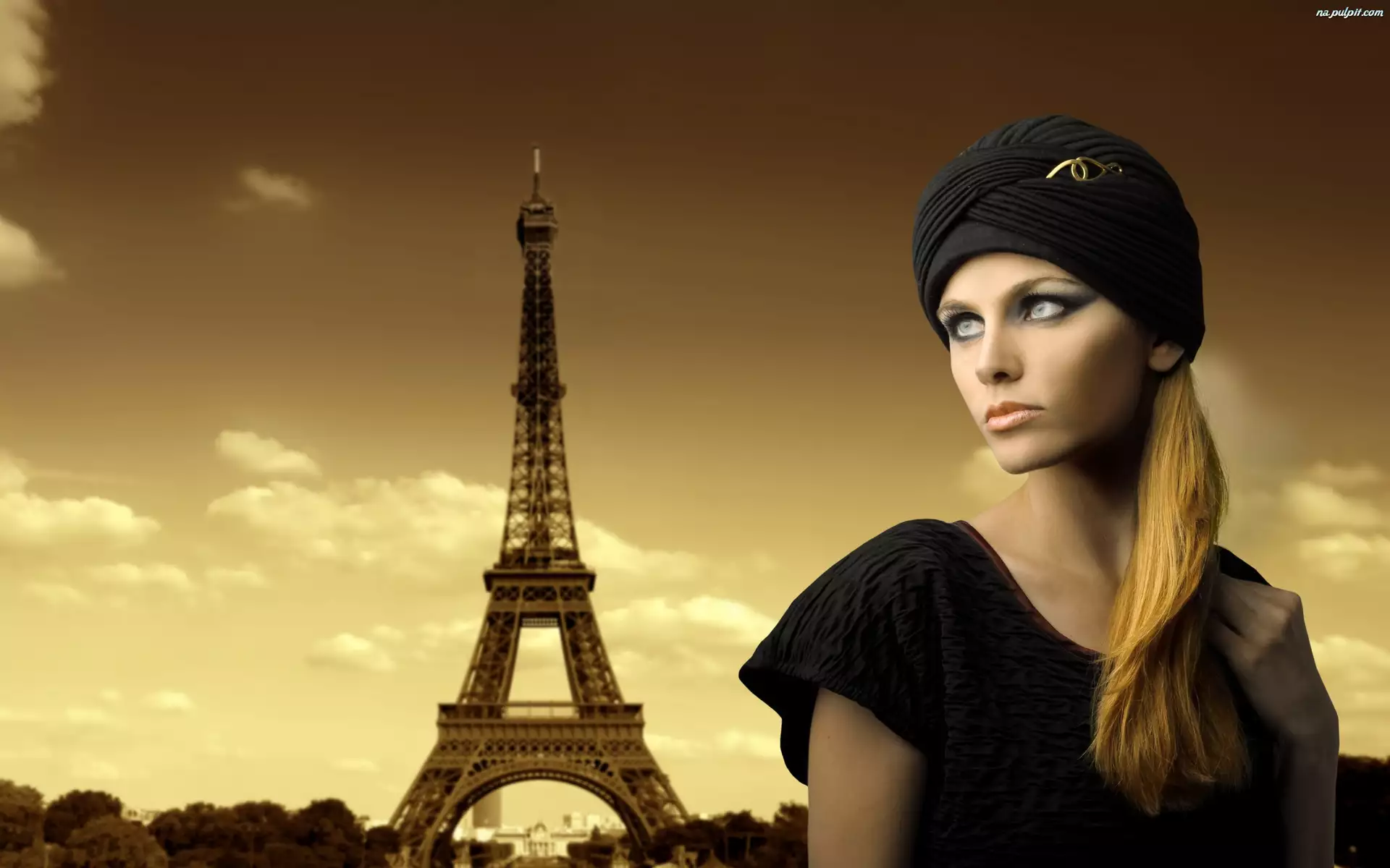 Blondynka, Kobieta, Turban, Wieża Eiffla, Makijaż, Paryż