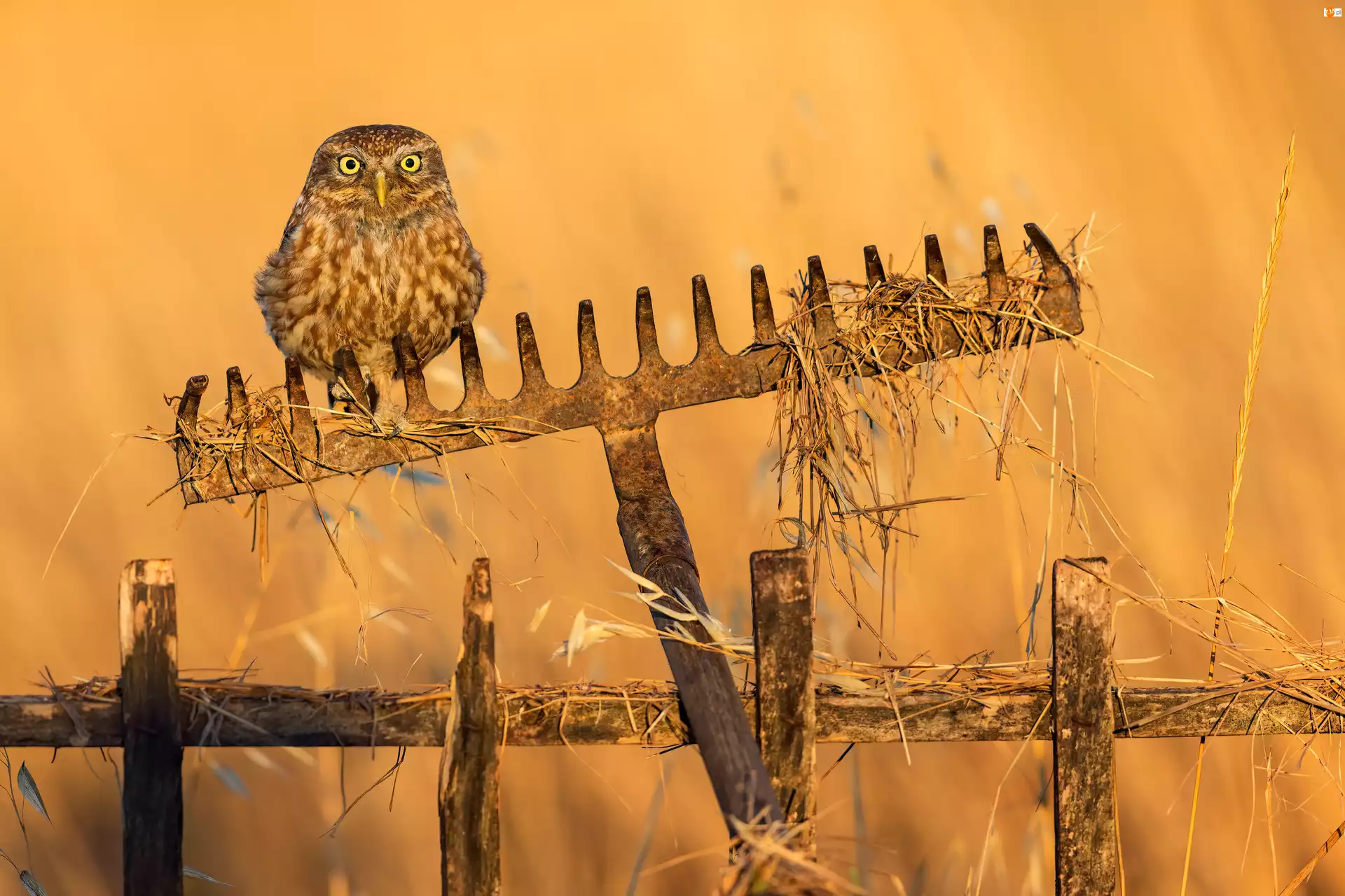 Mała sowa siedząca na grabiach