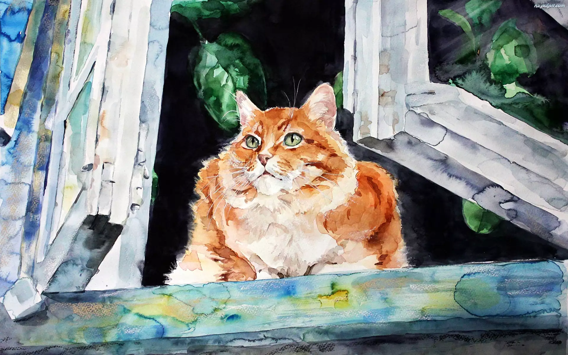 Malarstwo, Rudy, Obraz, Obraz, Kot, Liście, Natalia Chizhova, Okno