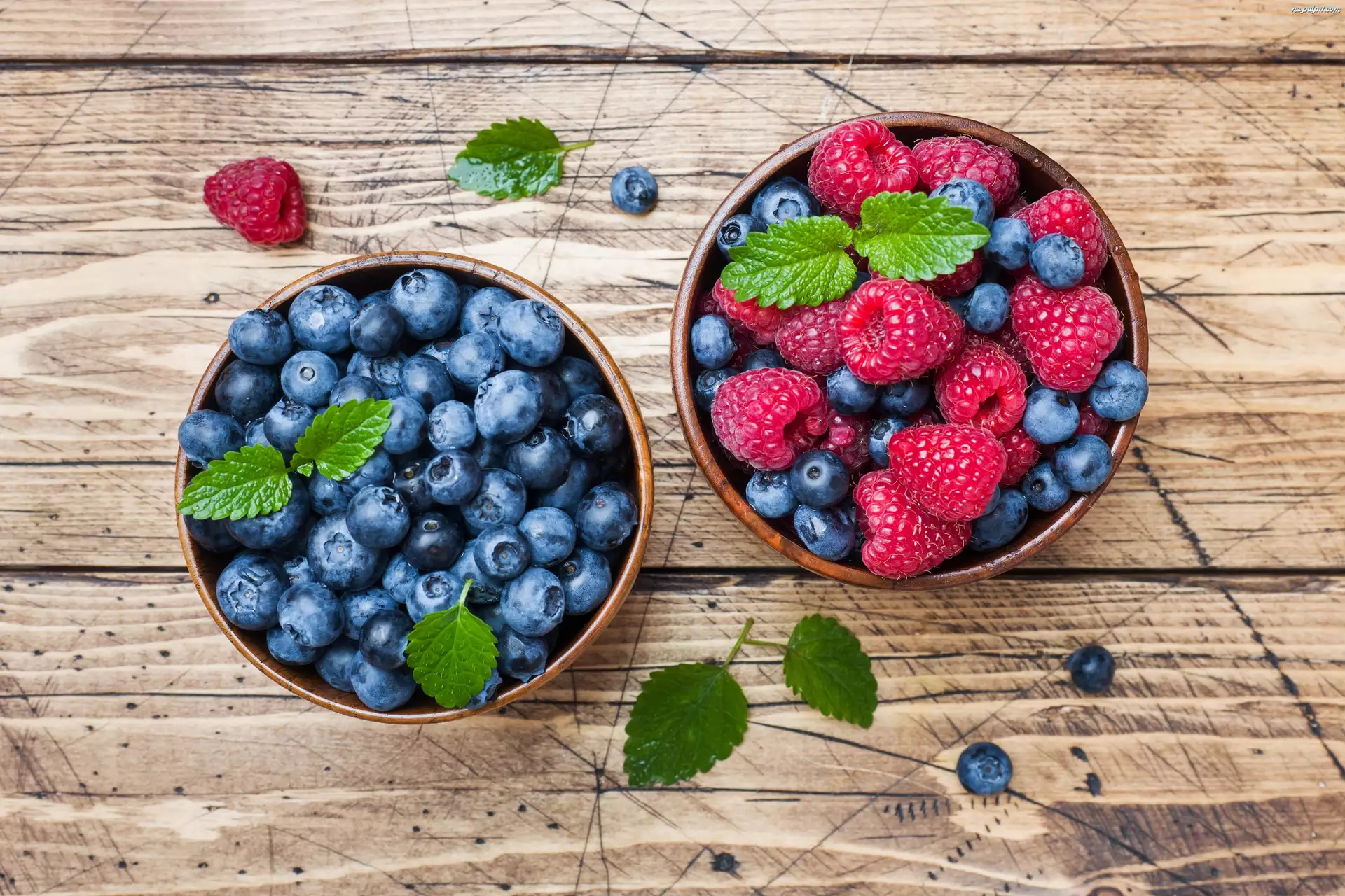Maliny, Owoce, Liście, Deska, Jagody, Miseczki
