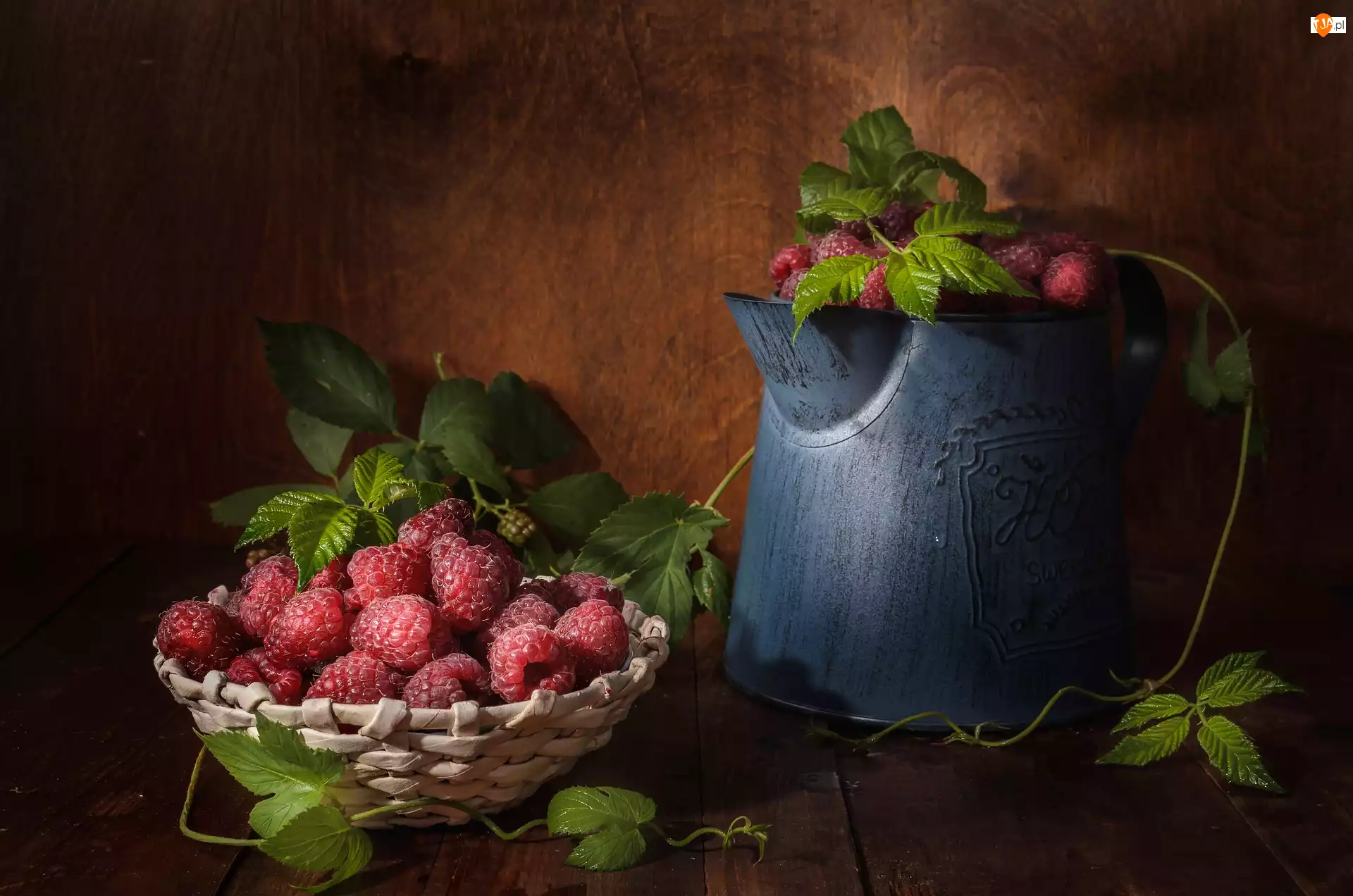 Maliny, Owoce, Liście, Kompozycja, Koszyk, Dzbanek