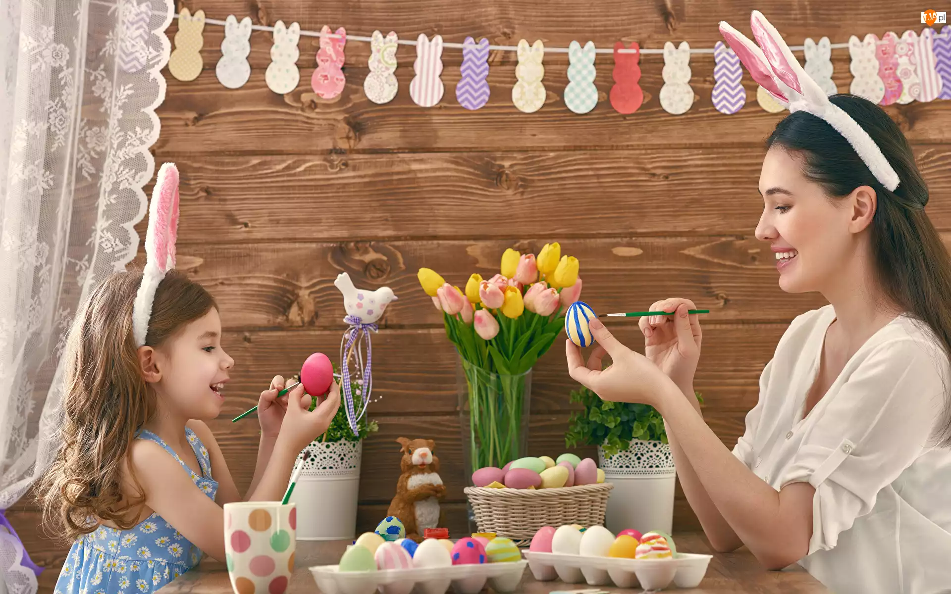 Tulipany, Mama, Pisanek, Jajka, Malowanie, Kobieta, Dziecko, Wielkanoc, Dziewczynka