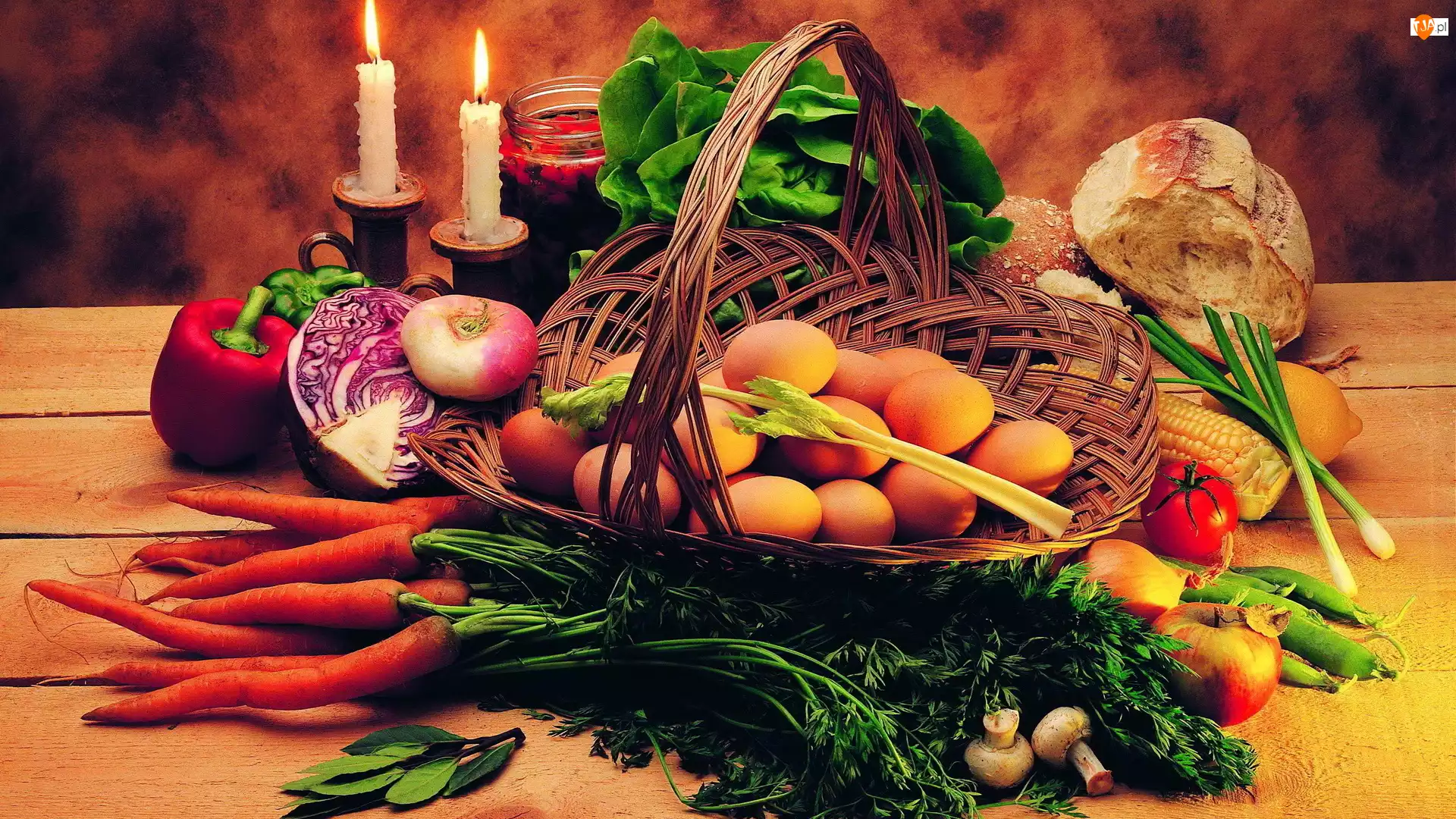 Marchew, Świece, Koszyk, Kompozycja, Warzywa i owoce, Jajka, Sałata