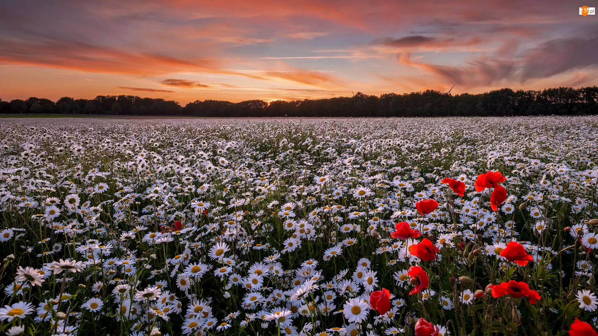 Maki, Niebo, Margerytki, Łąka, Zaróżowione