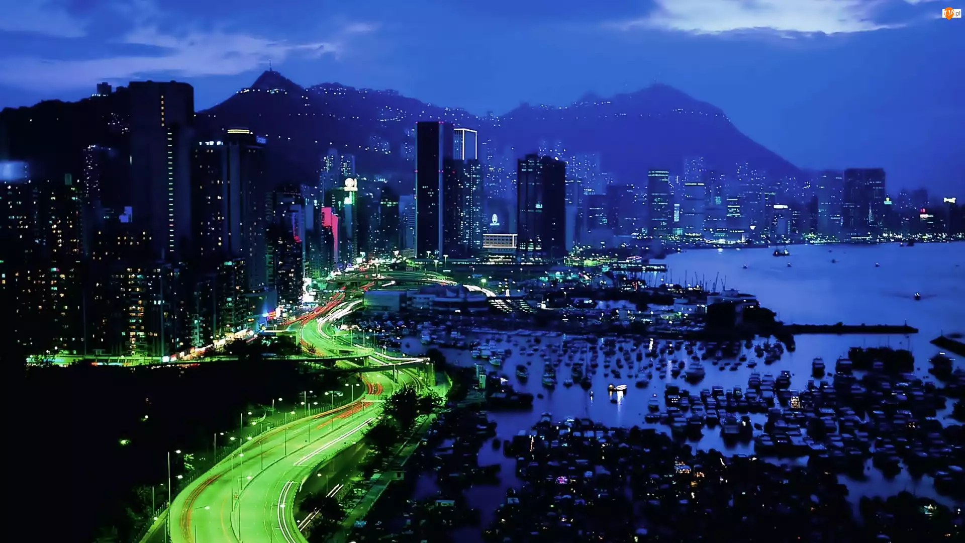 Hong Kong, Drapacze, Marina, Miasto, Chmur, Jachty, Nocą, Zatoka