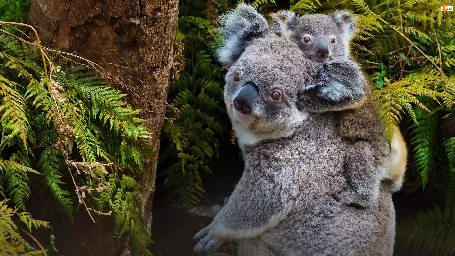 Matka, Koala, Drzewa, Las, Młody, Paprocie