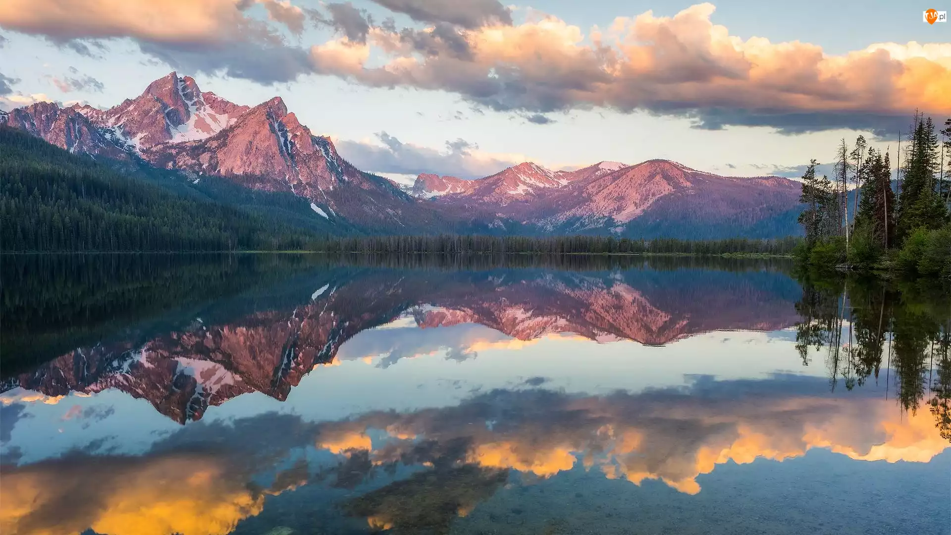 Mcgown Peak, Stanley Lake, Odbicie, Drzewa, Sawtooth Range, Stan Idaho, Jezioro, Góry, Chmury, Góra, Stany Zjednoczone