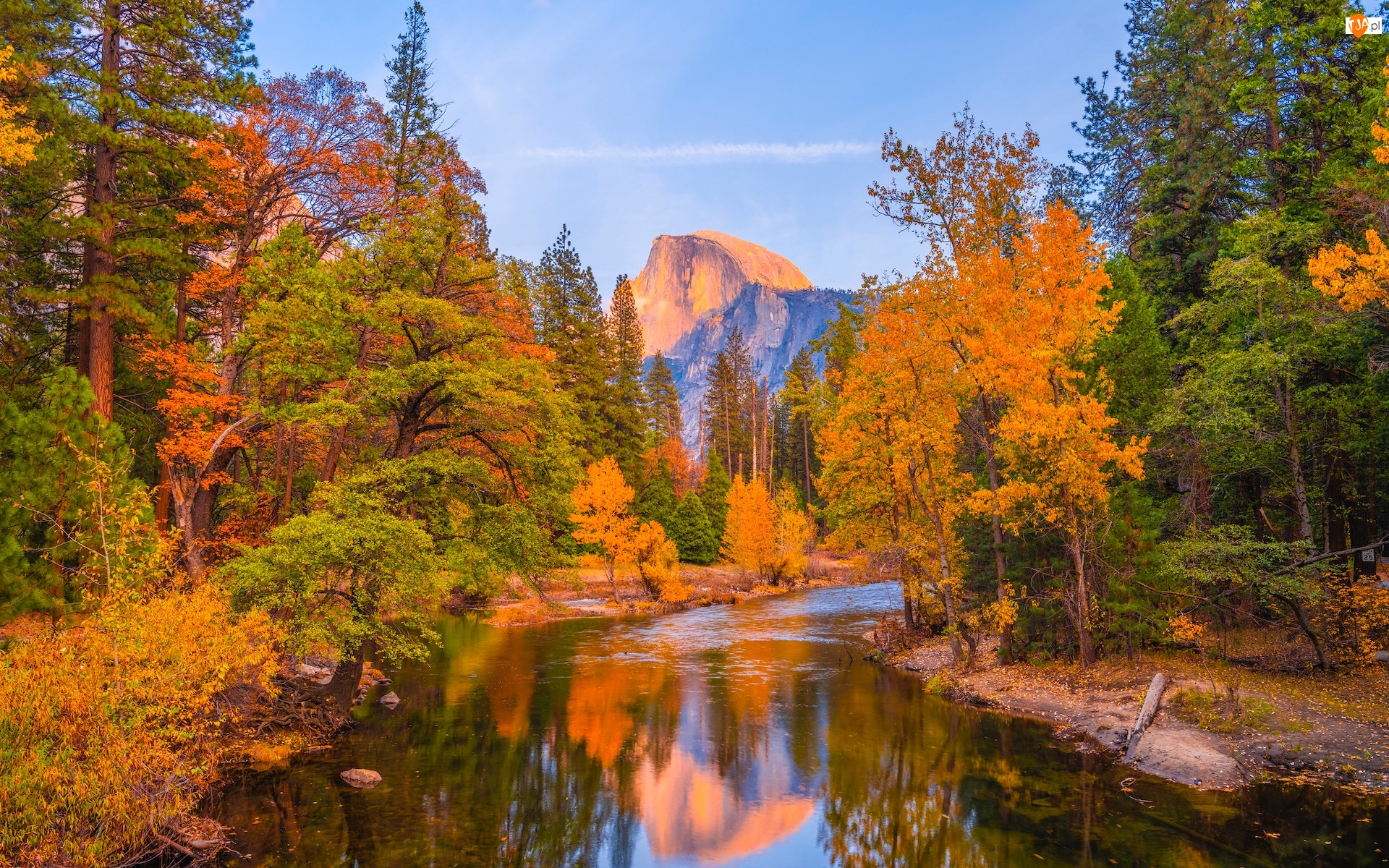 Merced River, Stany Zjednoczone, Jesień, Drzewa, Kalifornia, Rzeka, Góra Half Dome, Park Narodowy Yosemite