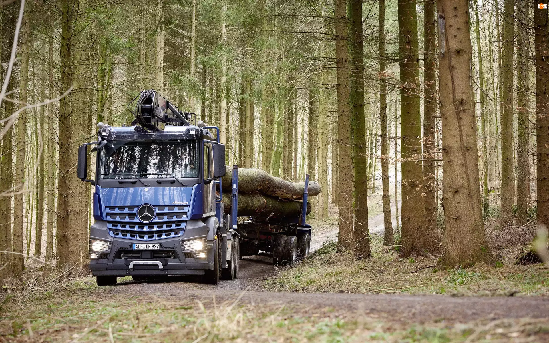 Mercedes-Benz Arocs z drzewem w lesie