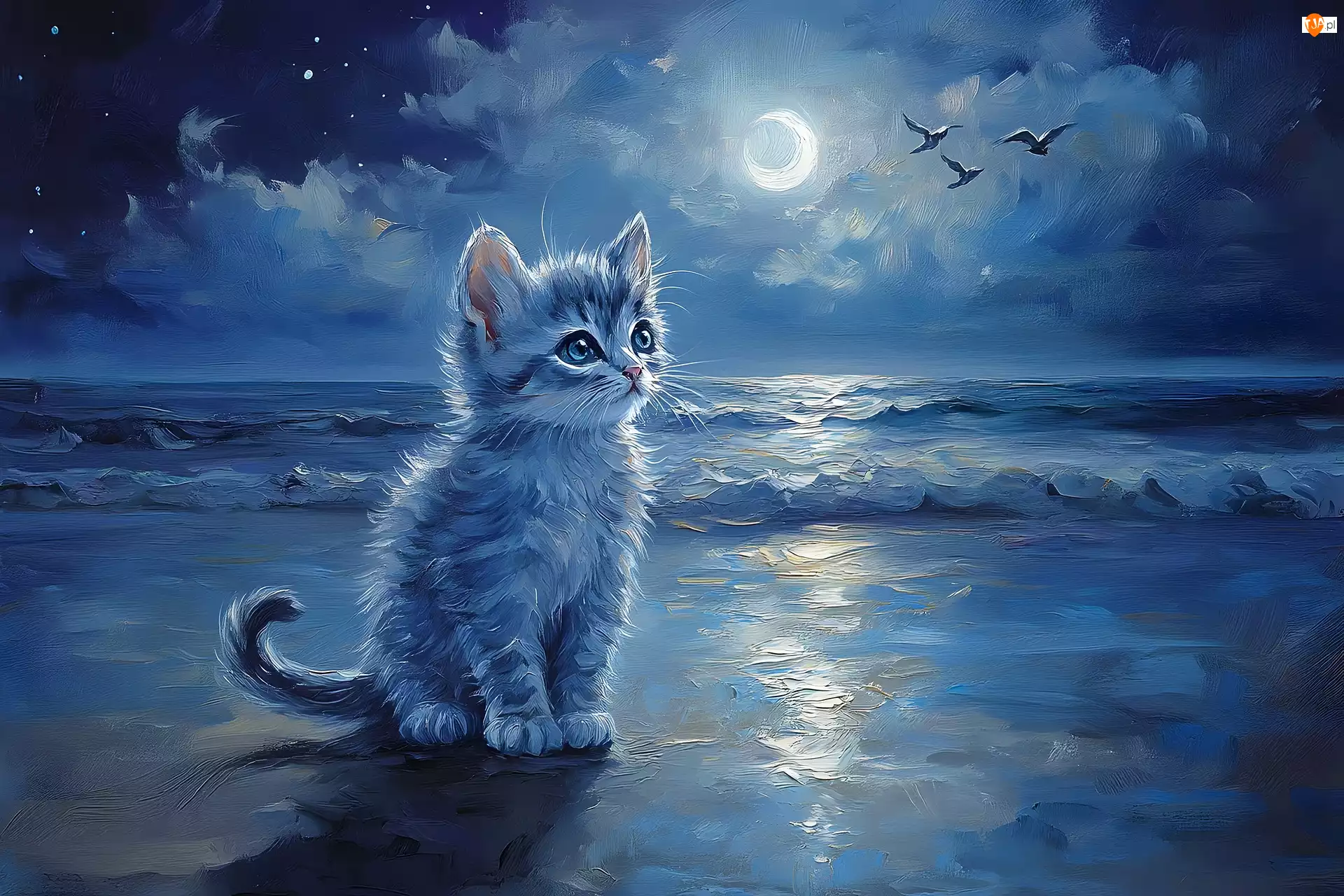 Mewy, Kotek, Księży, Grafika AI, Morze, Noc