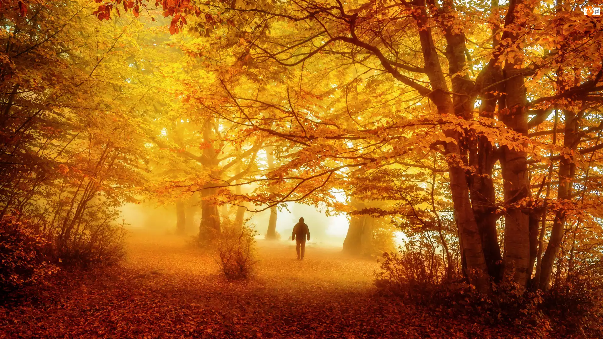 Mężczyzna, Las, Mgła, Jesień, Drzewa