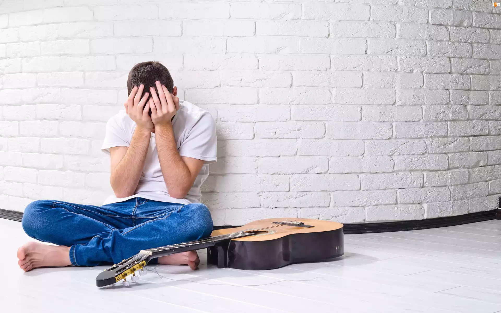 Ściana, Gitara, Mężczyzna, Smutny, Cegły