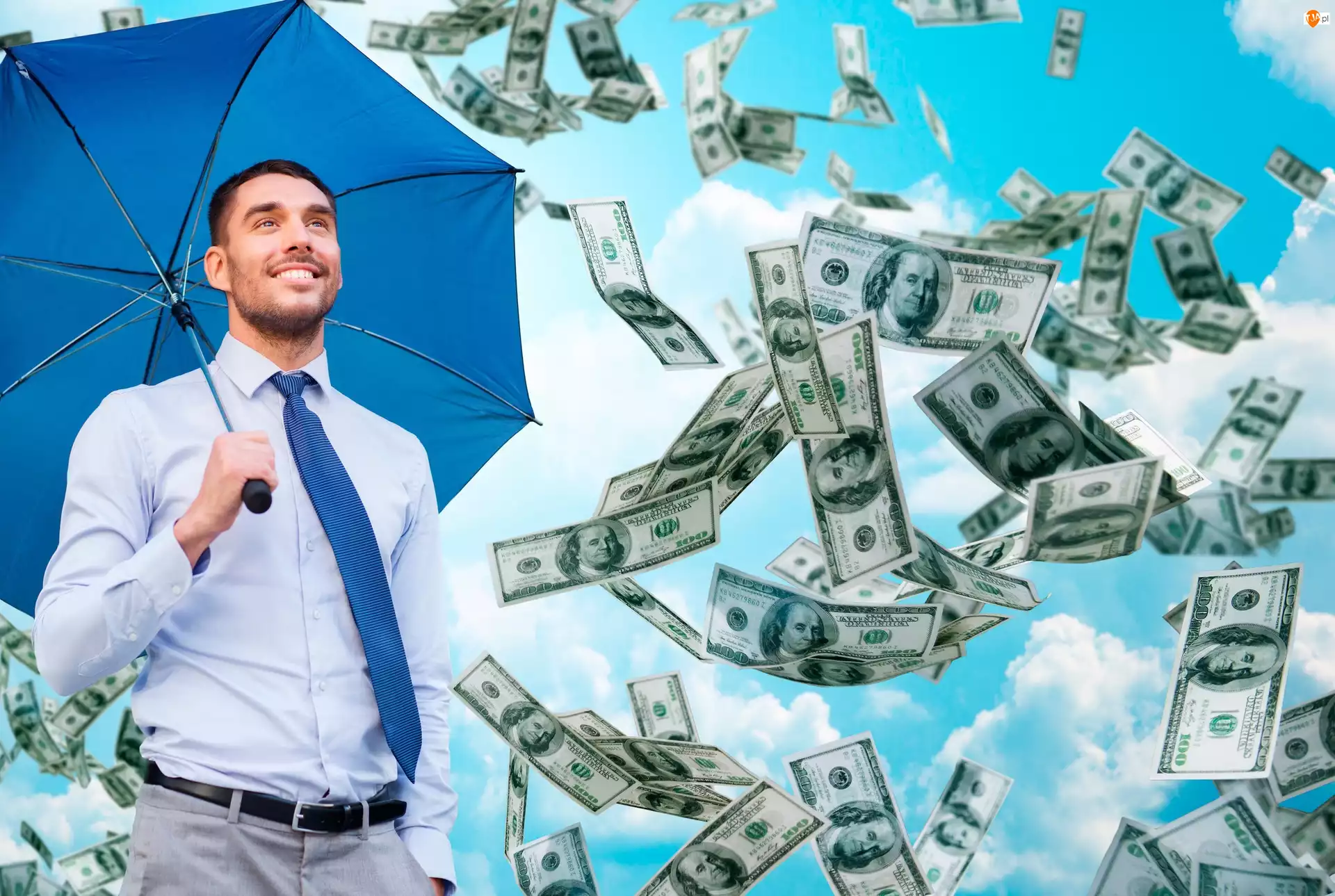 Mężczyzna z parasolem i dolarami