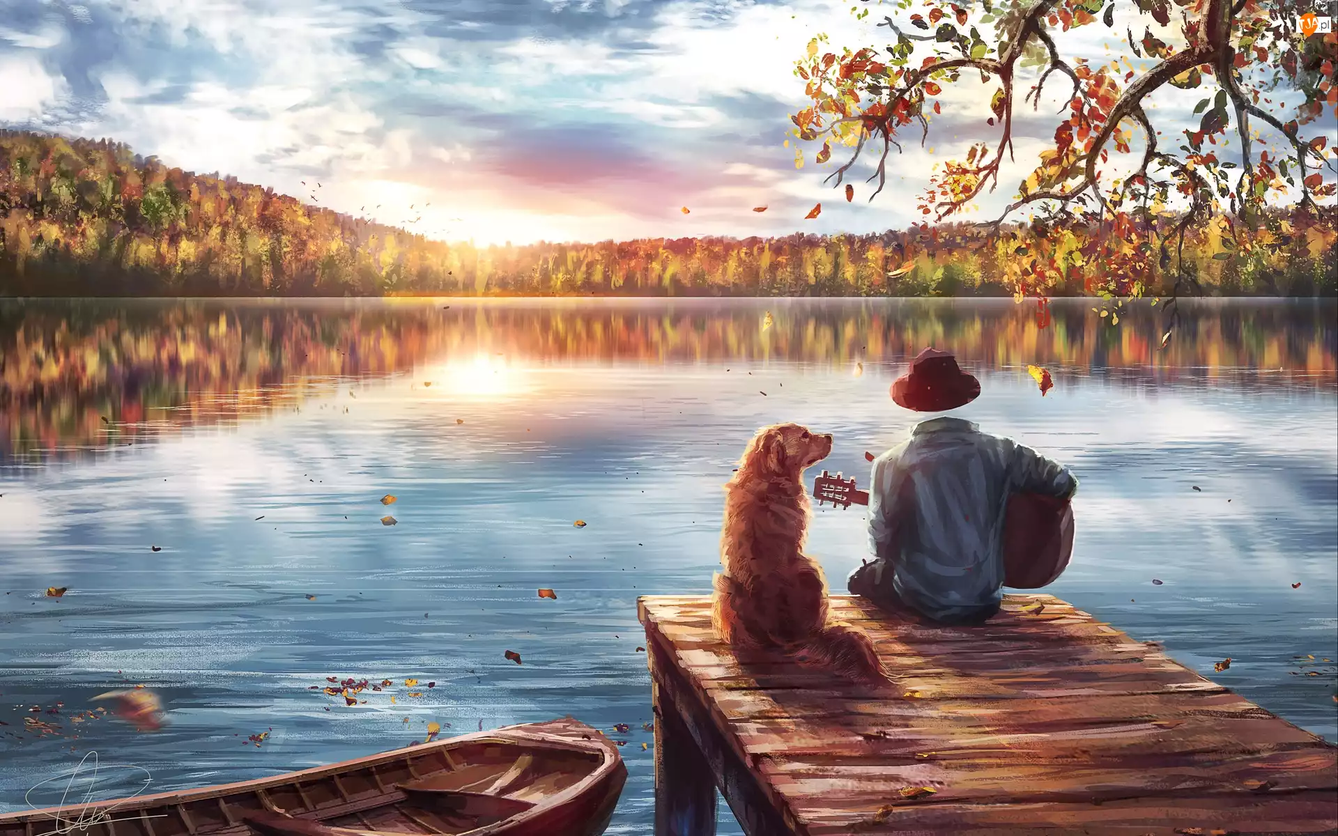 Gitara, Jesień, Pies, Łódź, Jezioro, Postać, Grafika, Pomost