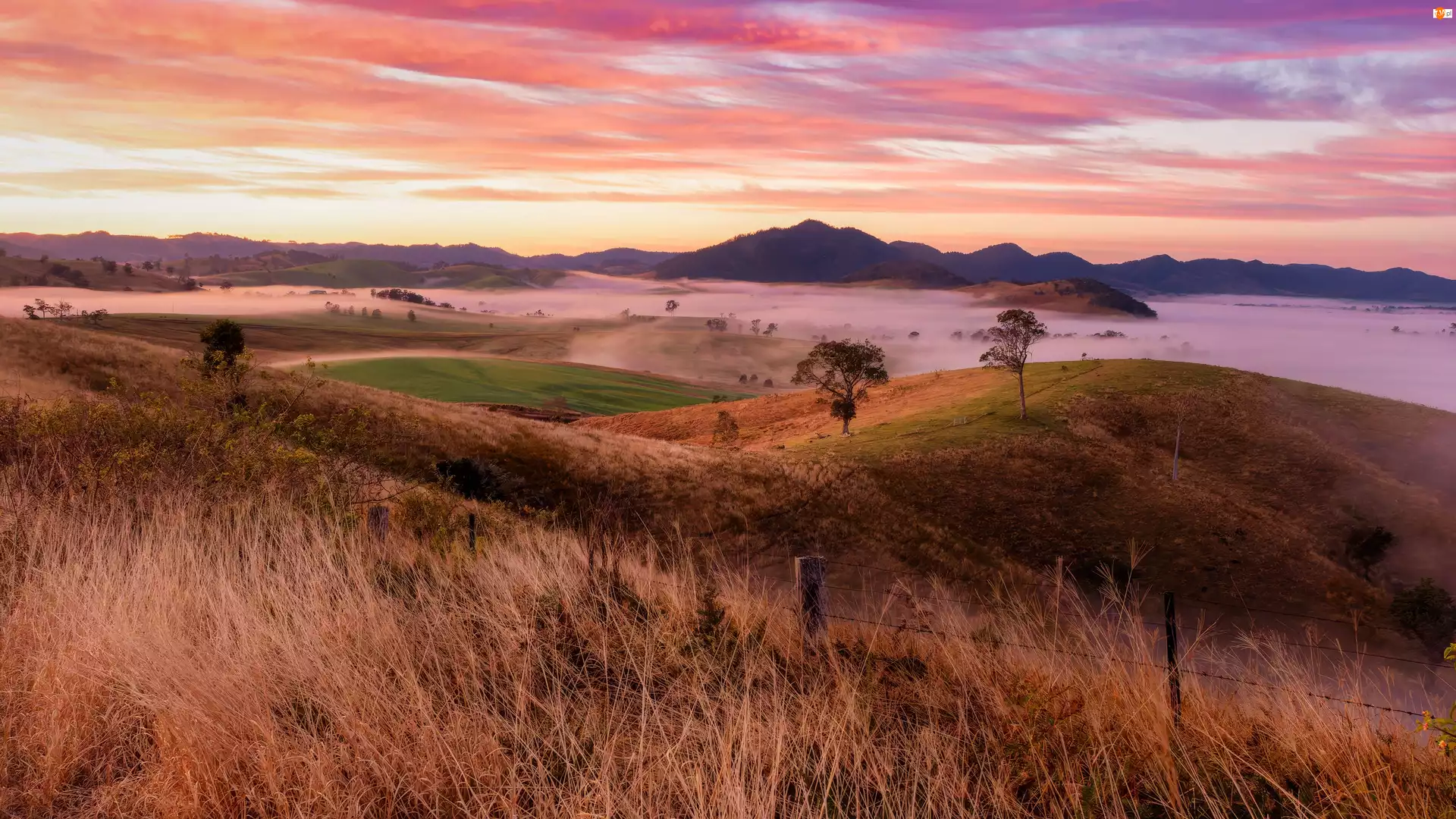 Mgła, Drzewa, Wzgórza, Trawa