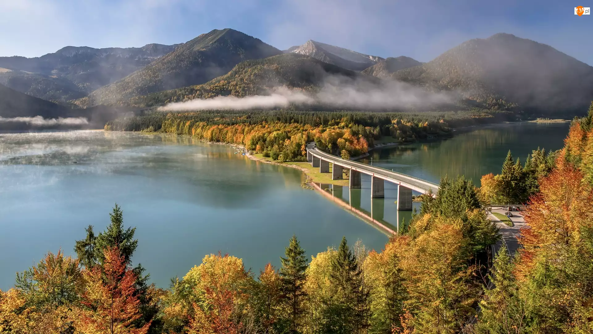 Mgła, Góry, Drzewa, Bawaria, Jezioro Sylvensteinsee, Jesień, Niemcy, Most