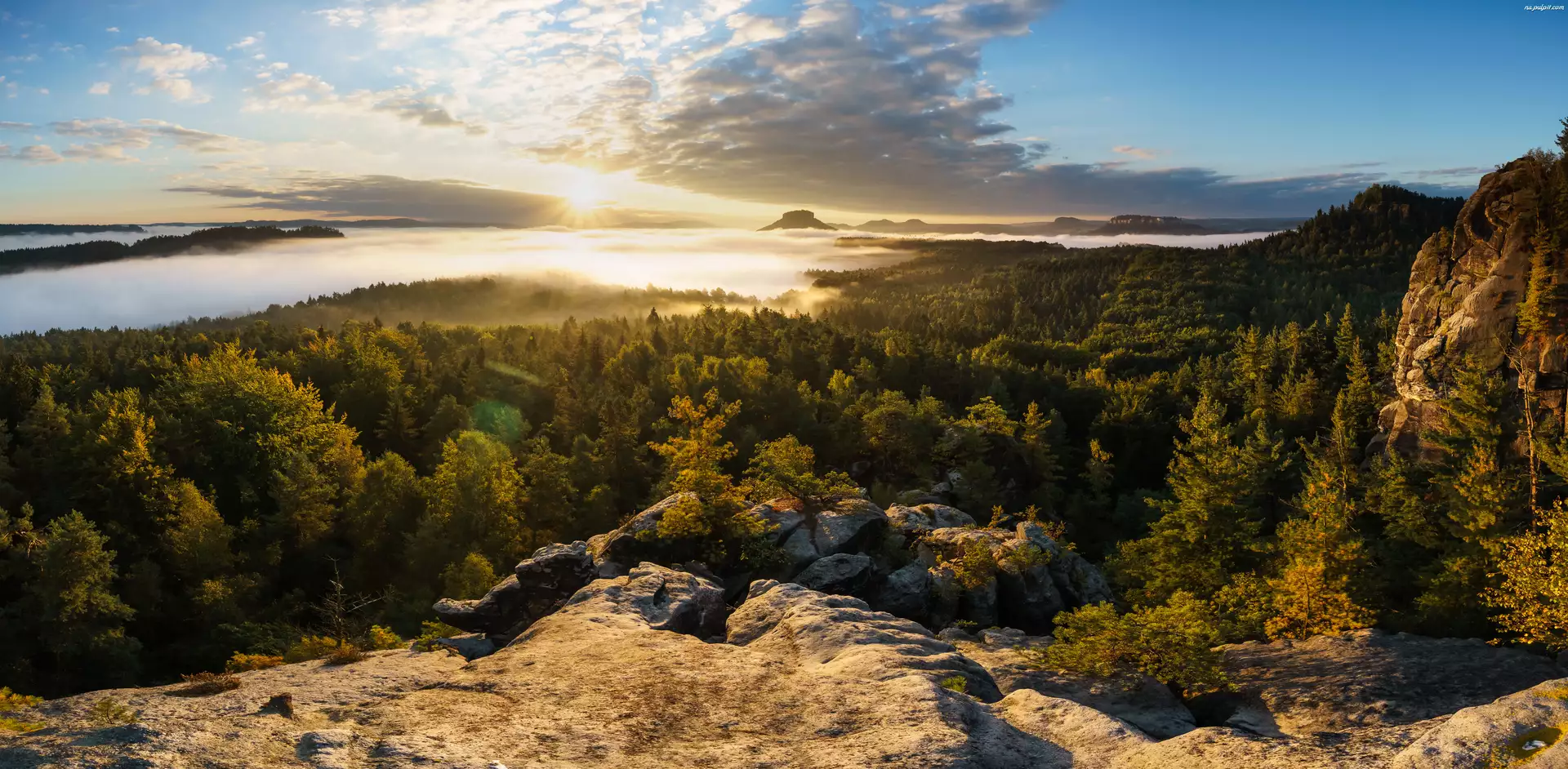 Wschód słońca, Góry, Lasy, Skały, Mgła