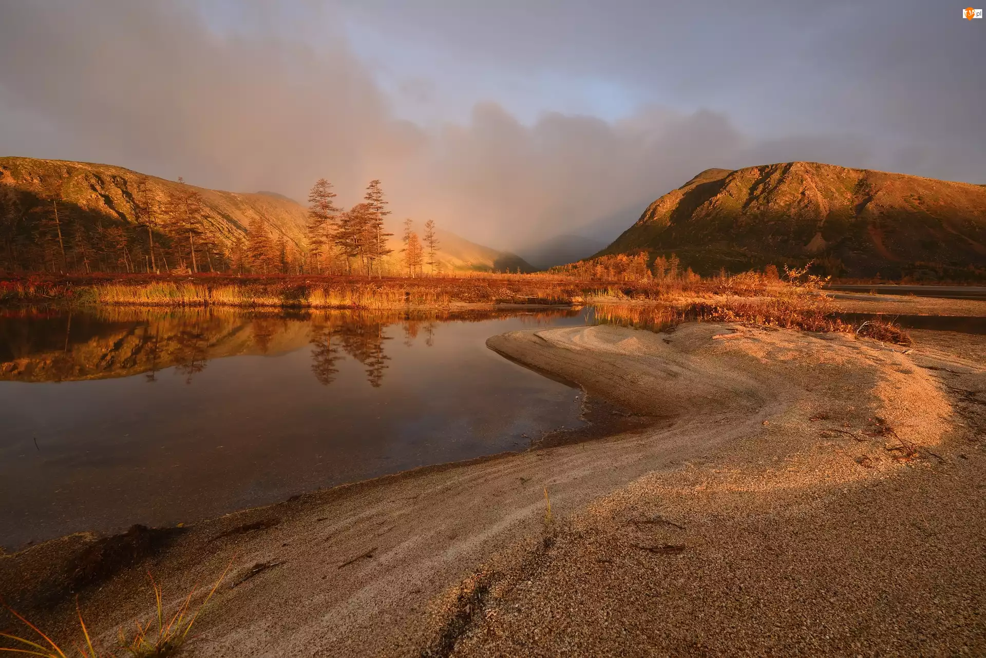 Kołyma, Góry, Mgła, Obwód magadański, Rzeka Purga, Jesień, Rosja, Drzewa