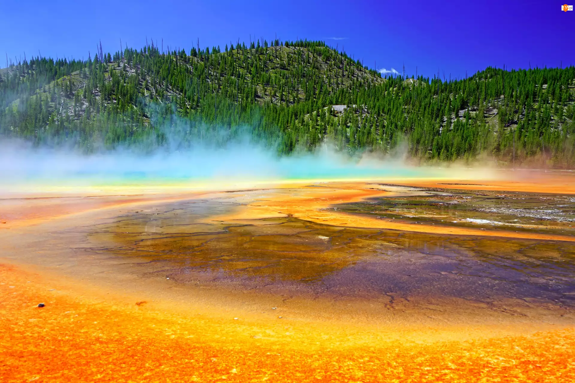 Park Narodowy Yellowstone, Stany Zjednoczone, Opary, Wzgórze, Gorące źródło, Las
