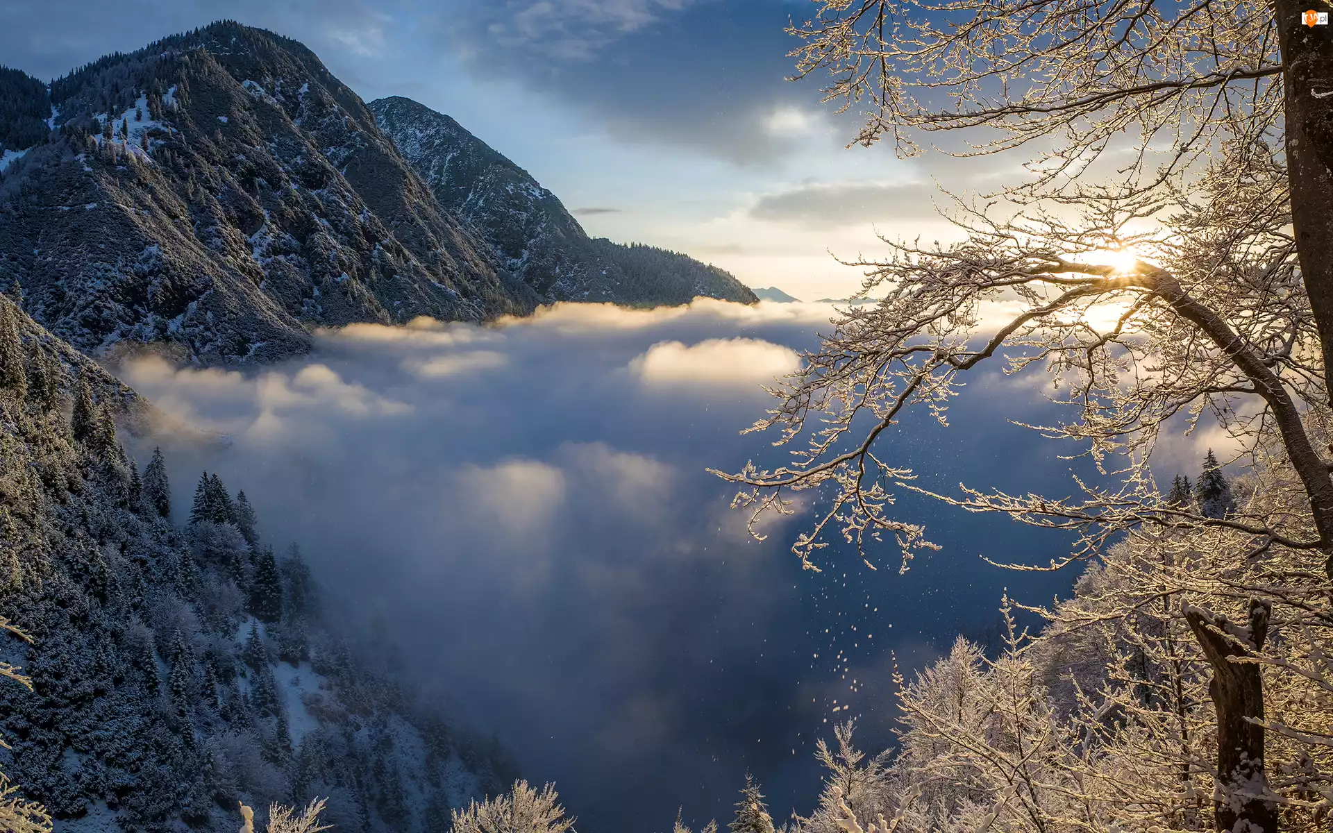 Drzewa, Zima, Mgła, Góry, Wschód słońca