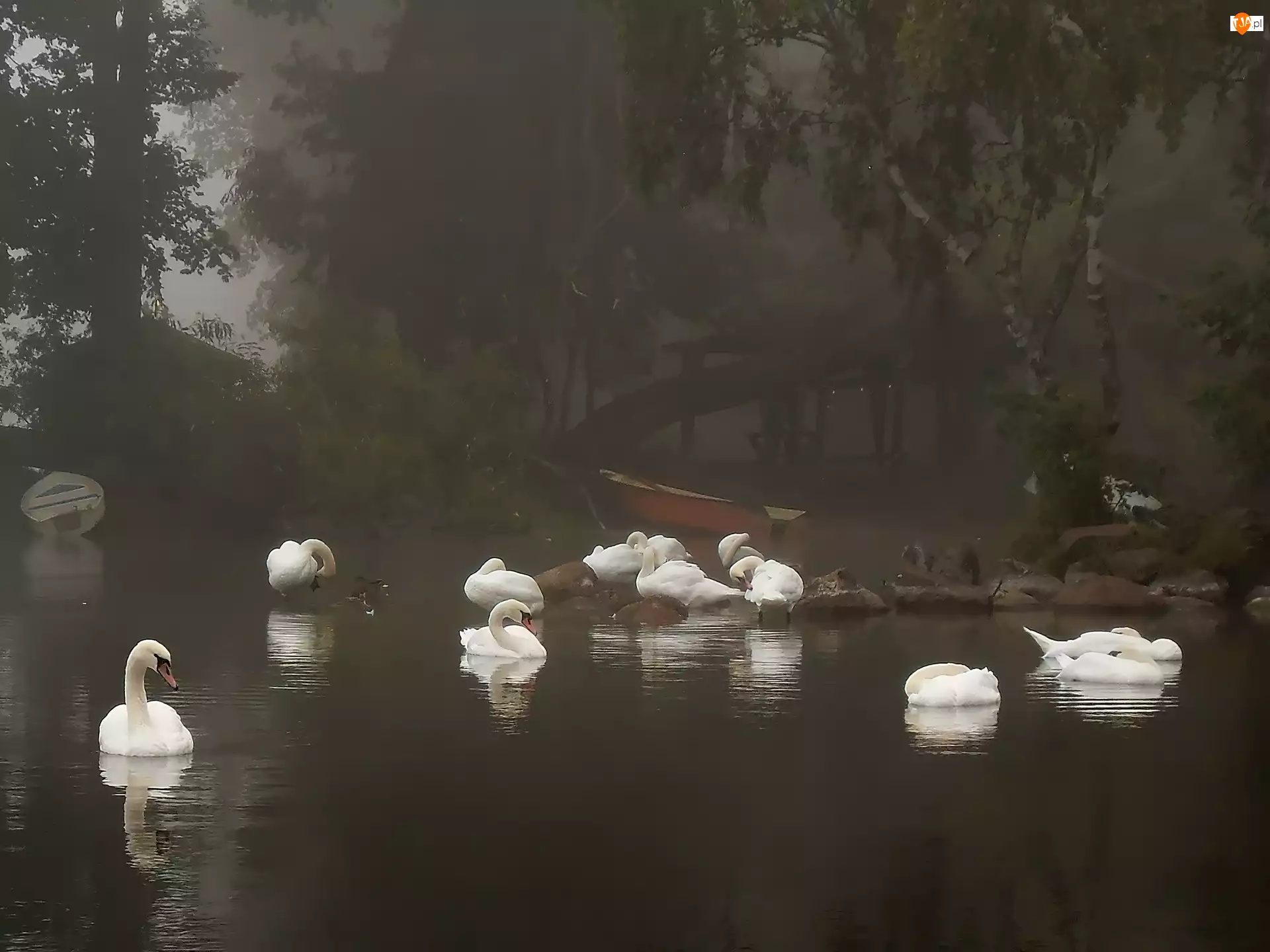 Mgła, Rzeka, Łódki, Łabędzie, Drzewa