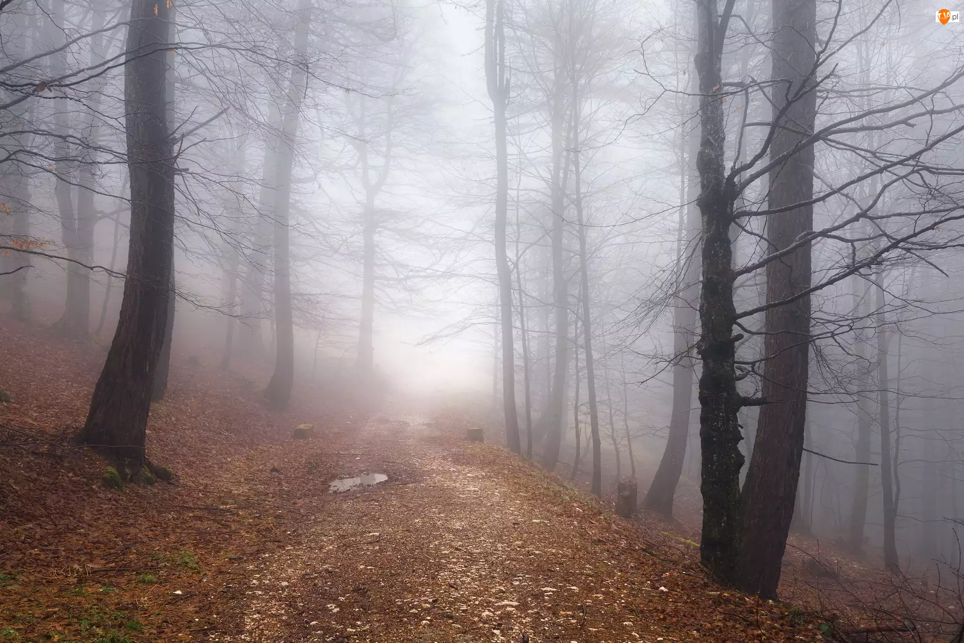 Bezlistne, Mgła, Las, Jesień, Drzewa
