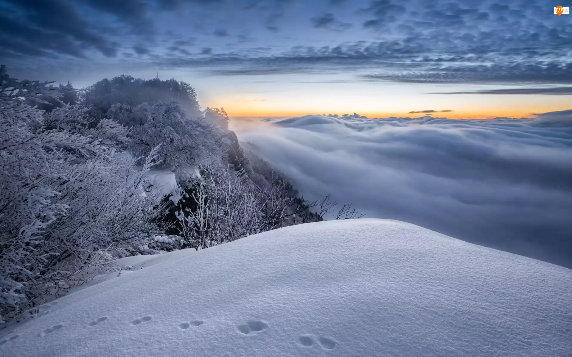 Mgła, Zima, Ośnieżone, Zachód słońca, Śnieg