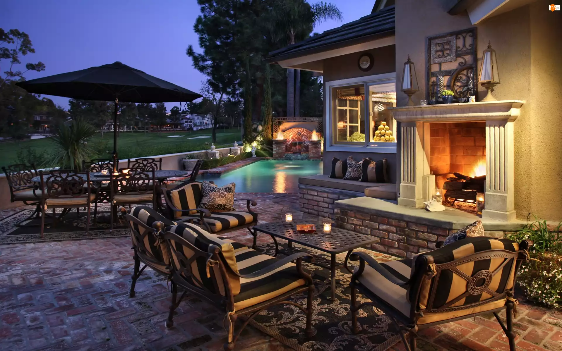 Miasteczko, Restauracje, Fotele, Stoliki, Fontanna