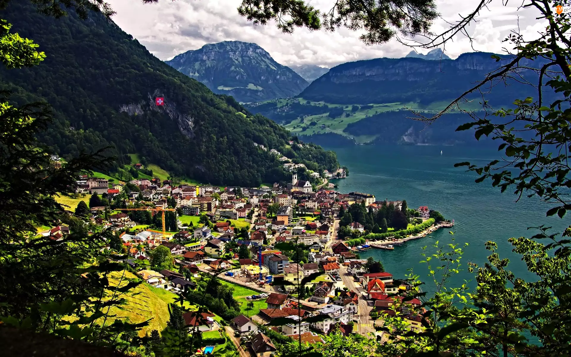 Miasto, Góry, Gersau, Panorama, Szwajcaria, Jezio