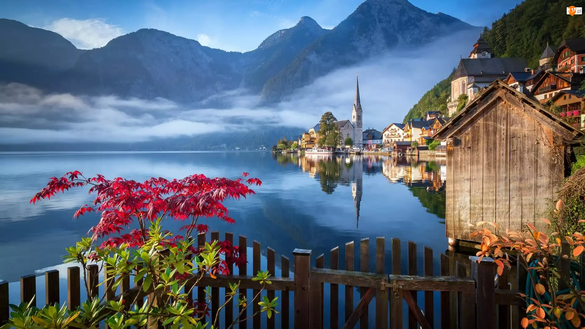 Kościół, Austria, Domy, Mgła, Hallstatt, Góry, Drzewa, Jezioro Hallstättersee