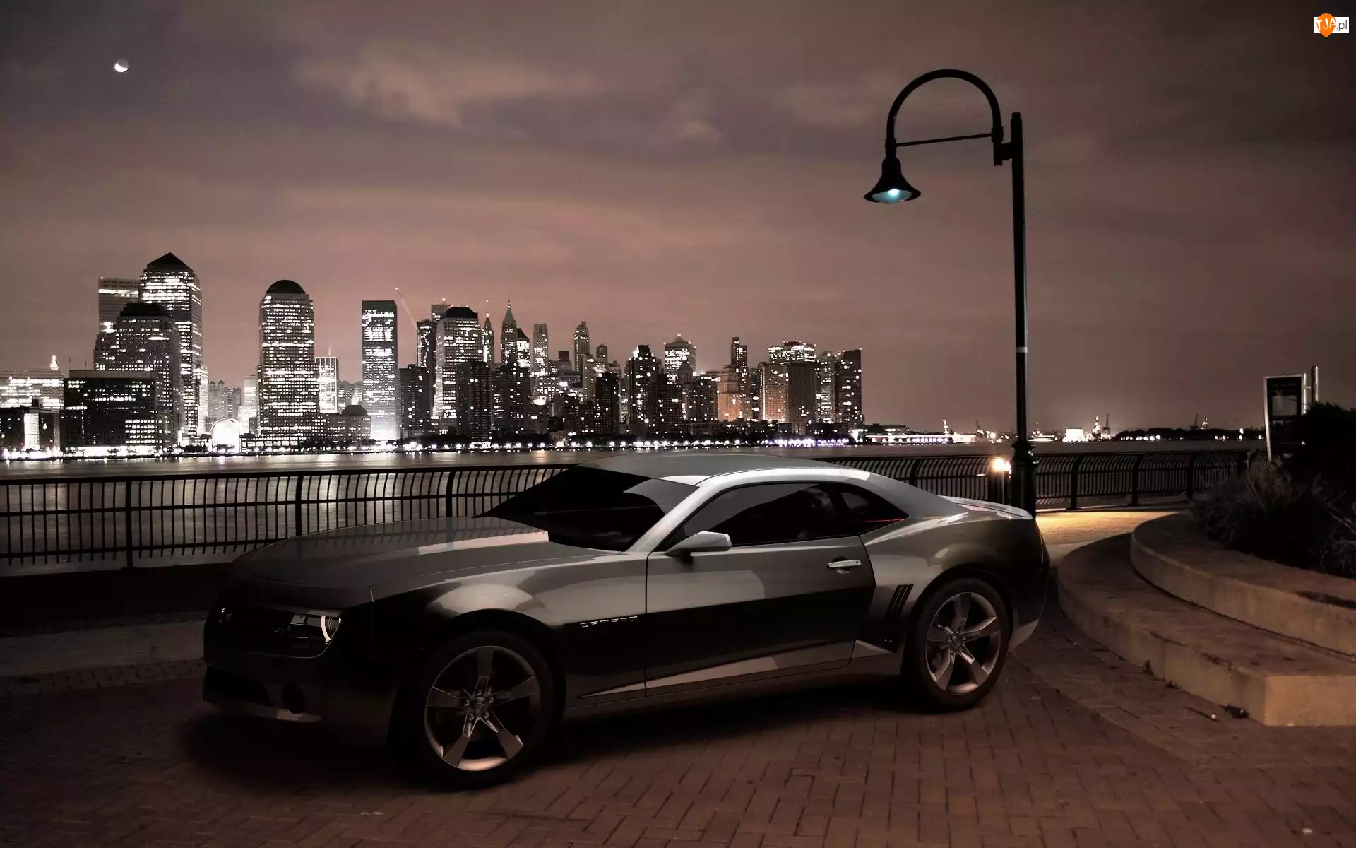 Miasto, Latarnia, Chevrolet, Noc, Camaro, Rzeka