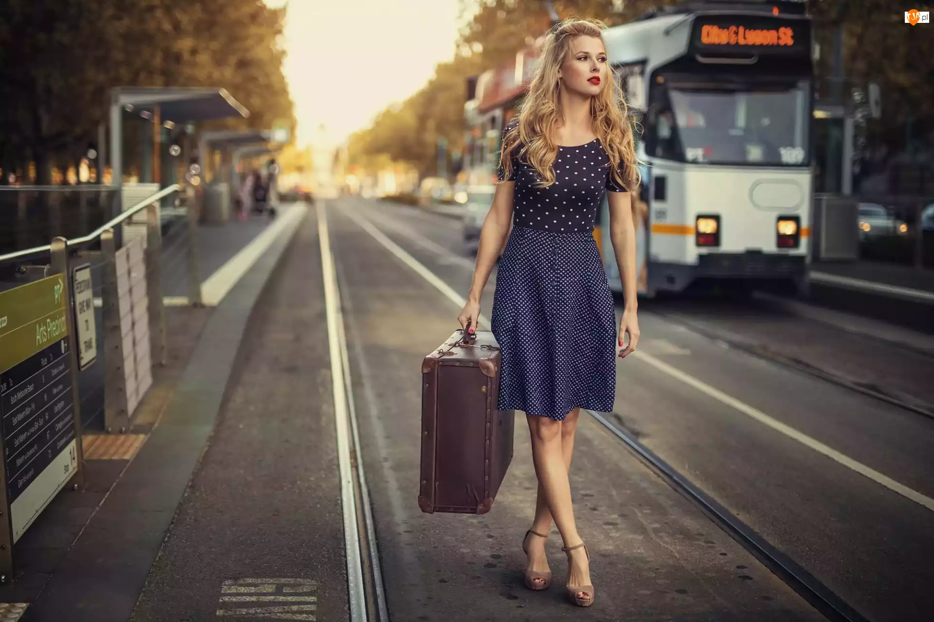 Miasto, Tory, Walizka, Kobieta, Tramwaj