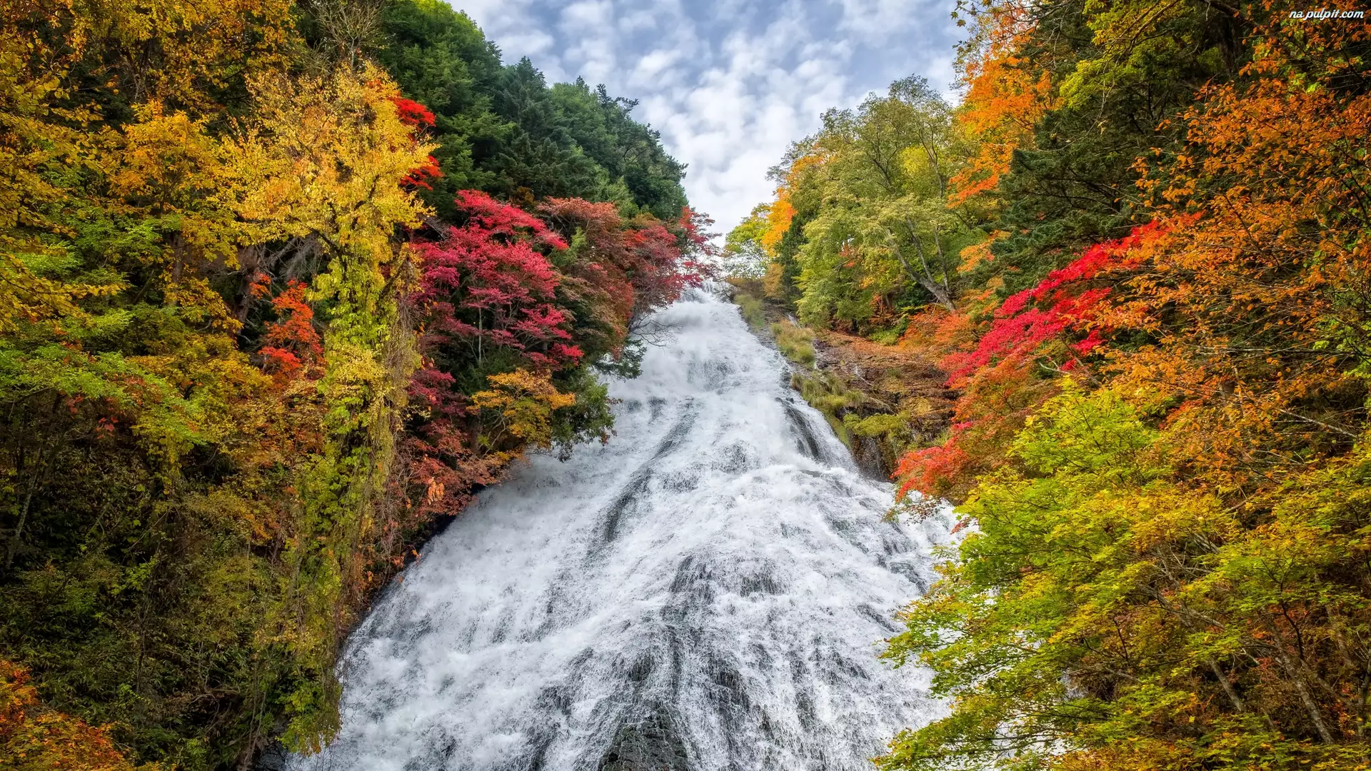 Prefektura Tochigi, Japonia, Wodospad Yudaki, Drzewa, Park Narodowy Nikko, Jesień