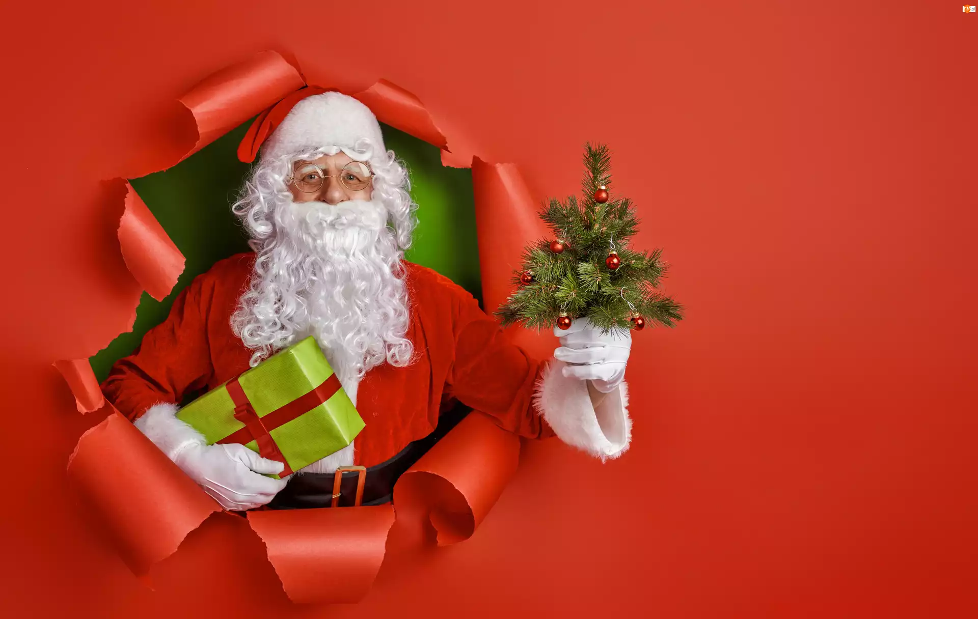 Choinka, Tło, Prezent, Mikołaj, Czerwone