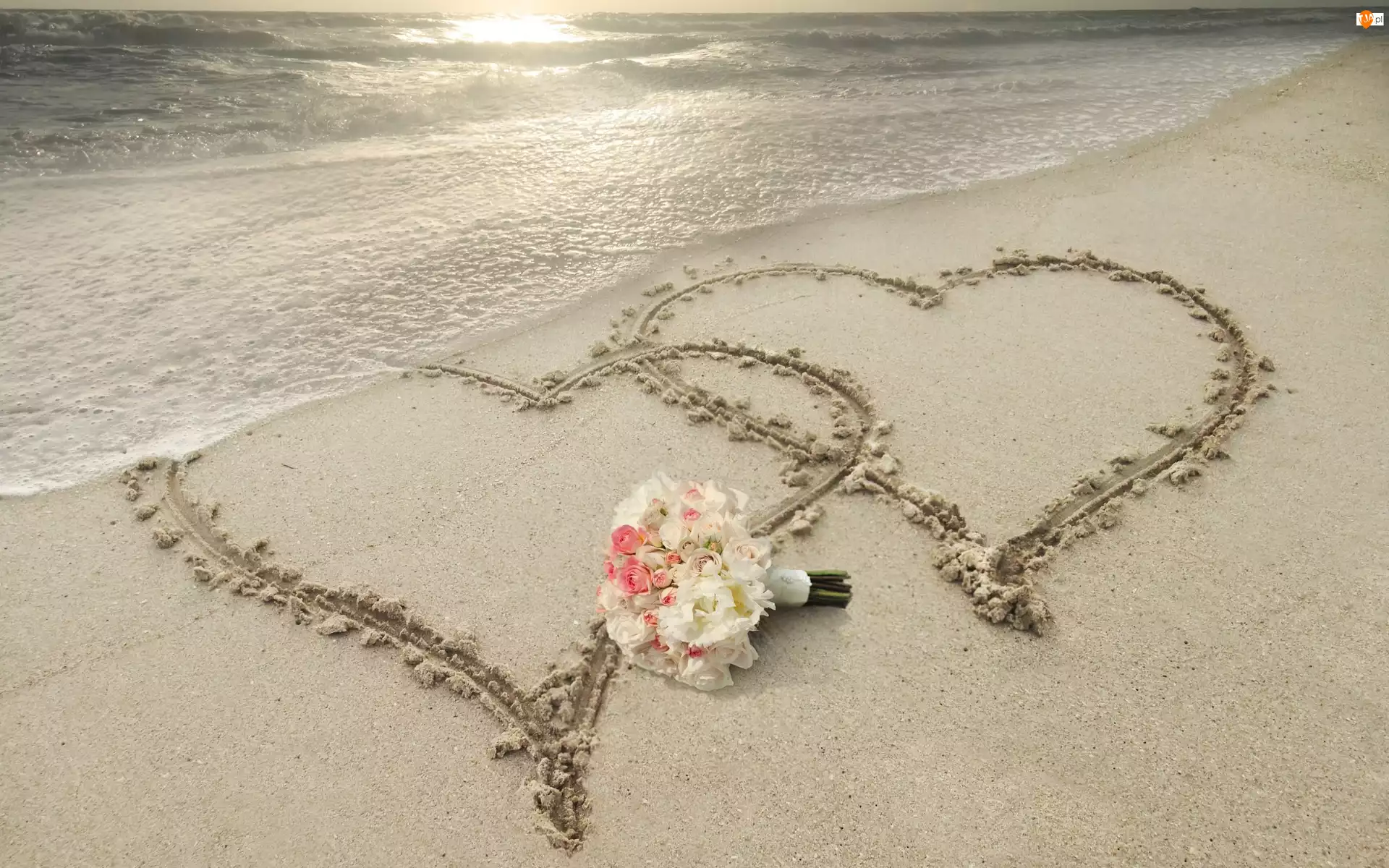 Miłosne, Morze, Serca, Plaża, Kwiaty