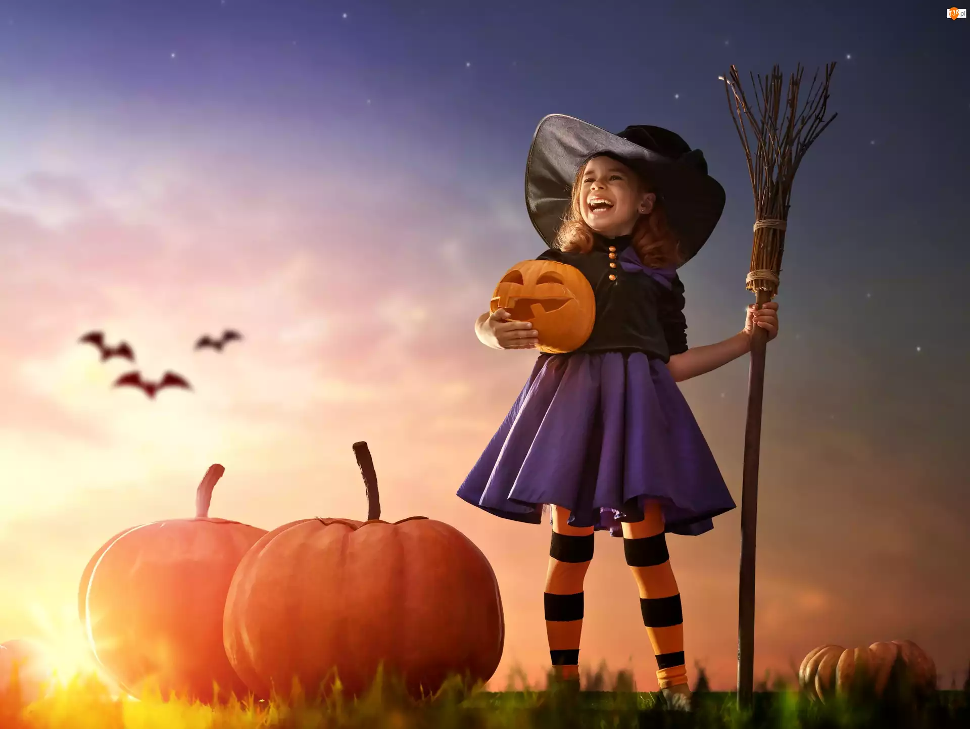 Miotła, Halloween, Dynie, Dziewczynka, Nietoperze