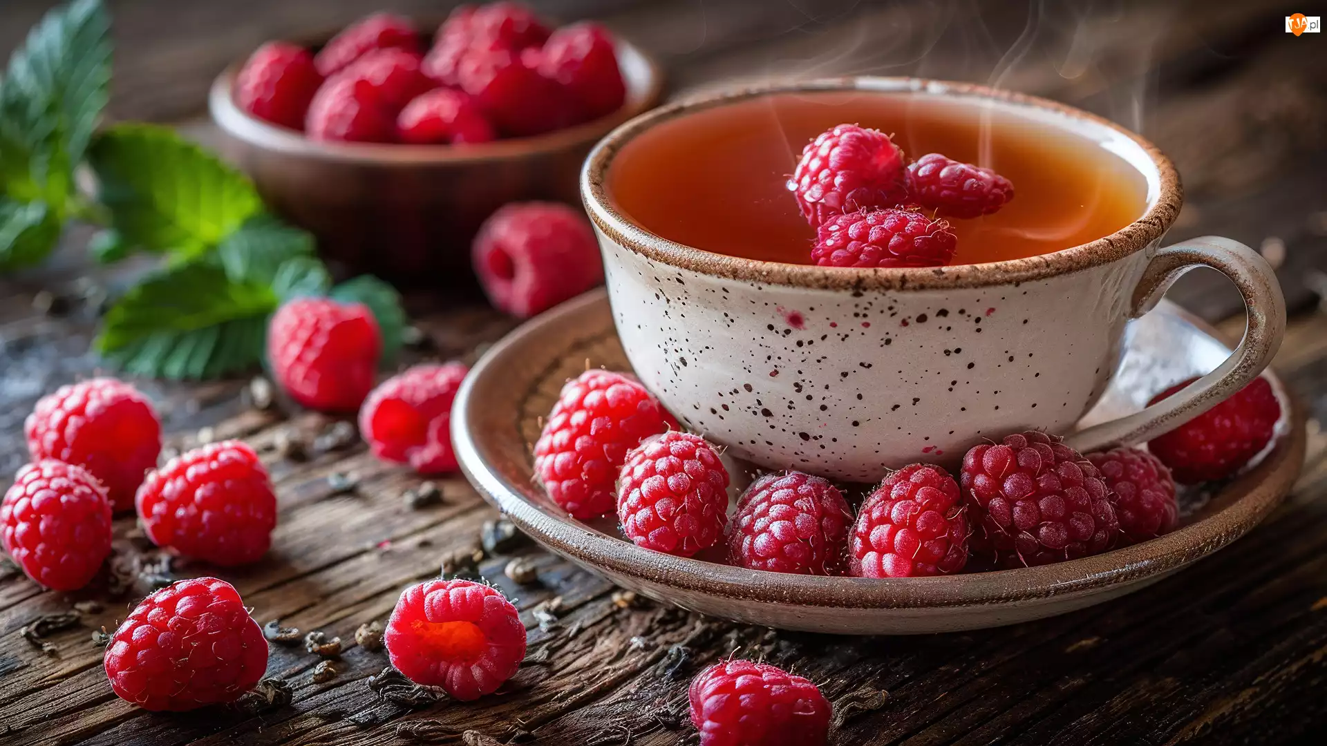 Miseczka, Filiżanka, Maliny, Liście, Herbata, Sp
