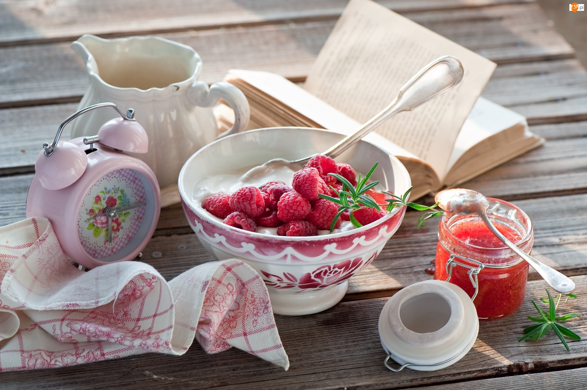 Miseczka, Książka, Jogurt, Deser, Maliny, Dżem