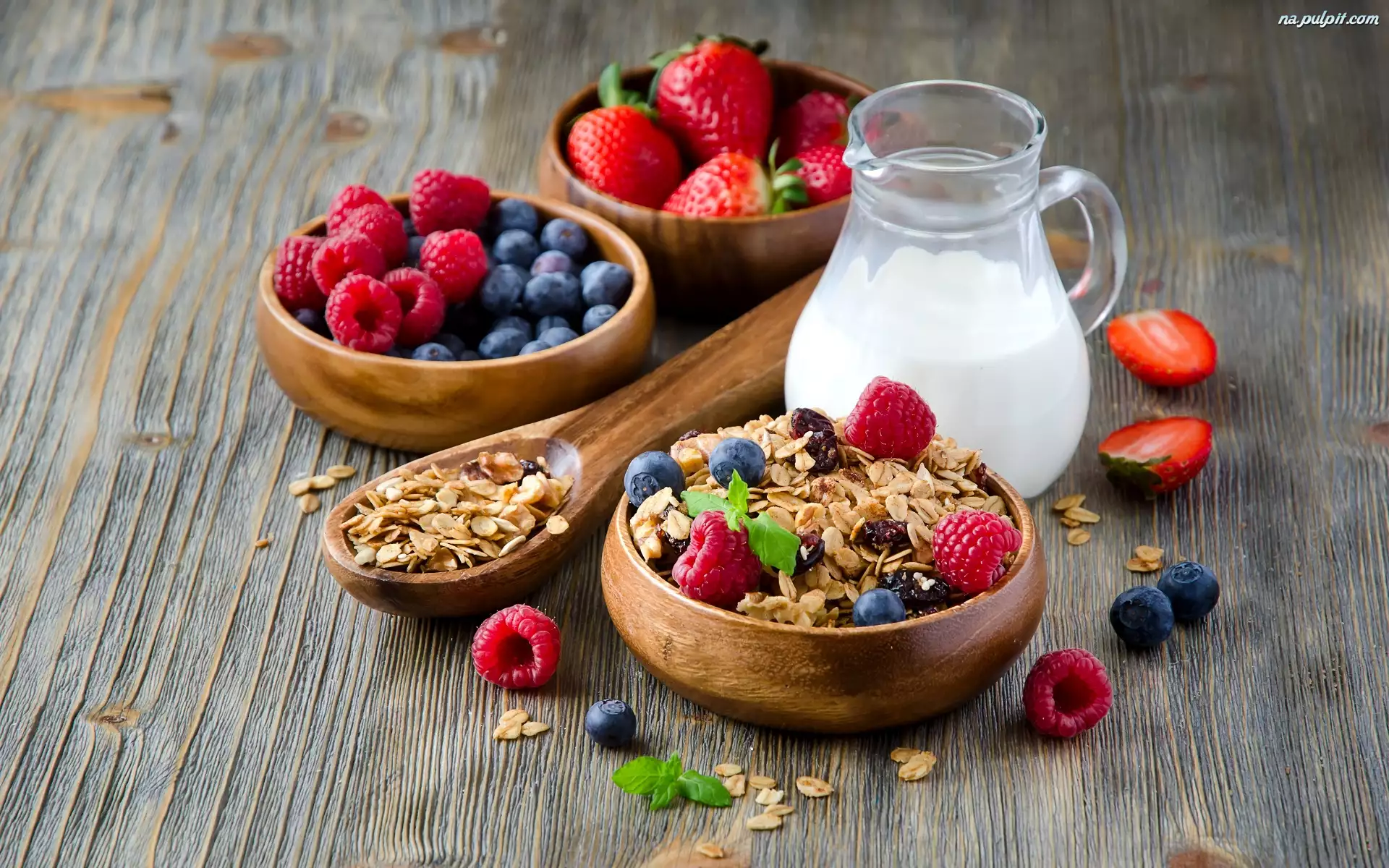 Miseczki, Musli, Jagody, Owoce, Mleko, Maliny, Łyżka, Dzbanek, Truskawki, Drewniane, Deski Owoce