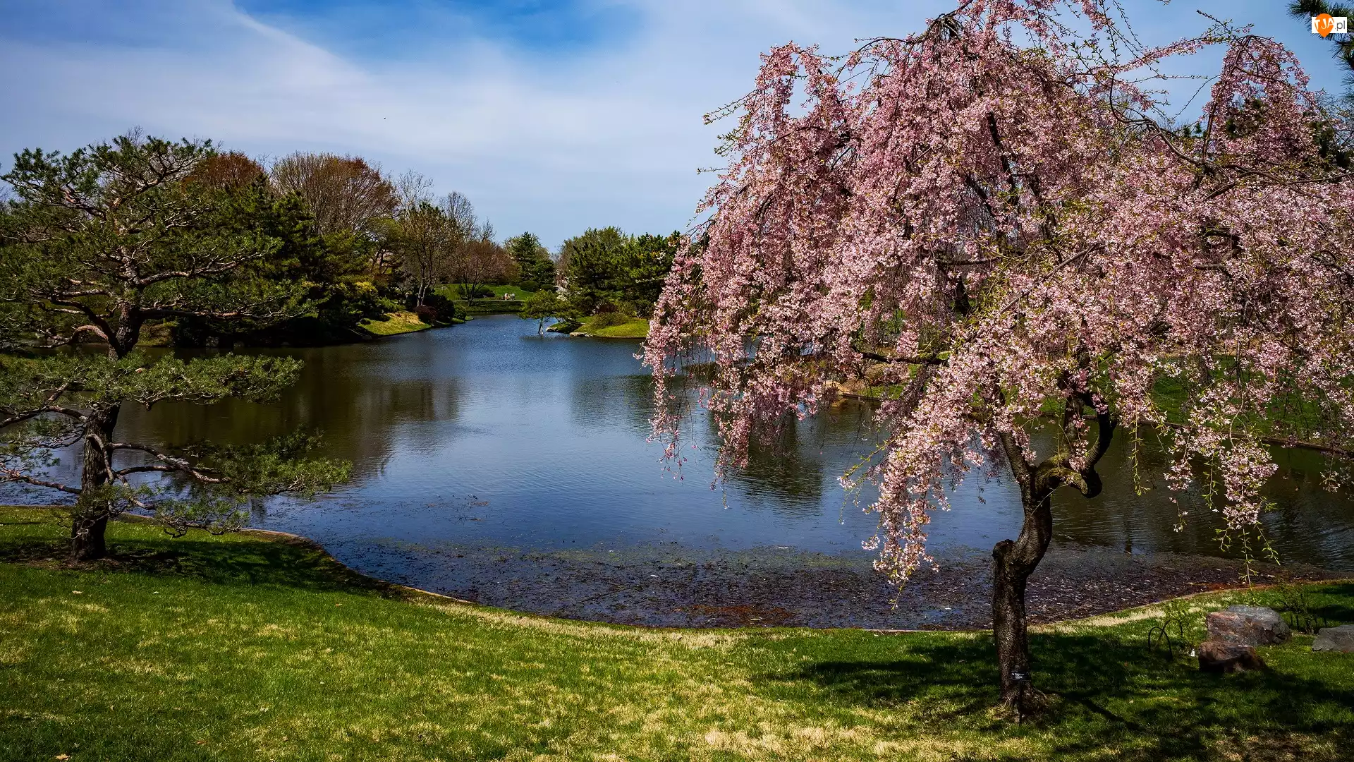 Stan Missouri, Stany Zjednoczone, Ogród botaniczny Missouri Botanical Garden, Staw, Saint Louis, Drzewa