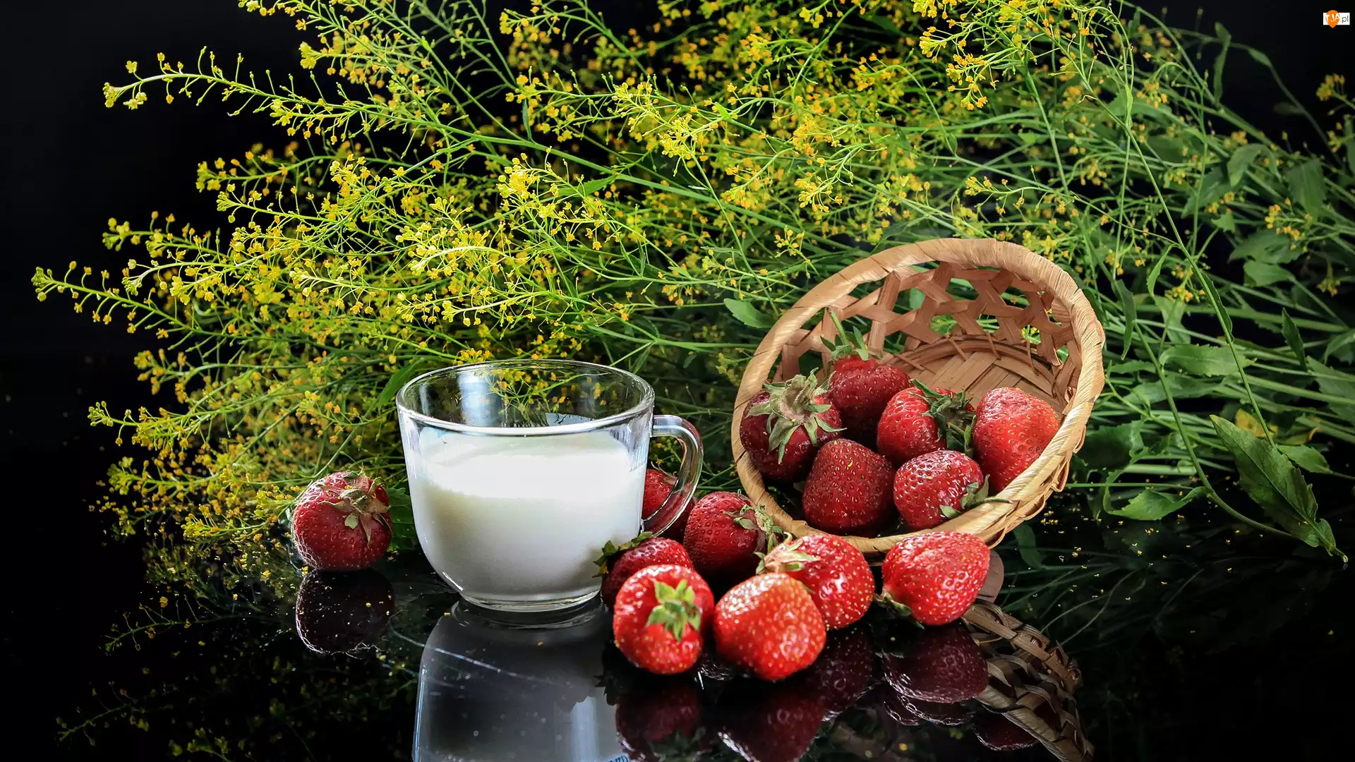 Mleko, Truskawki, Koszyczek, Kompozycja, Filiżanka, Kwiatki