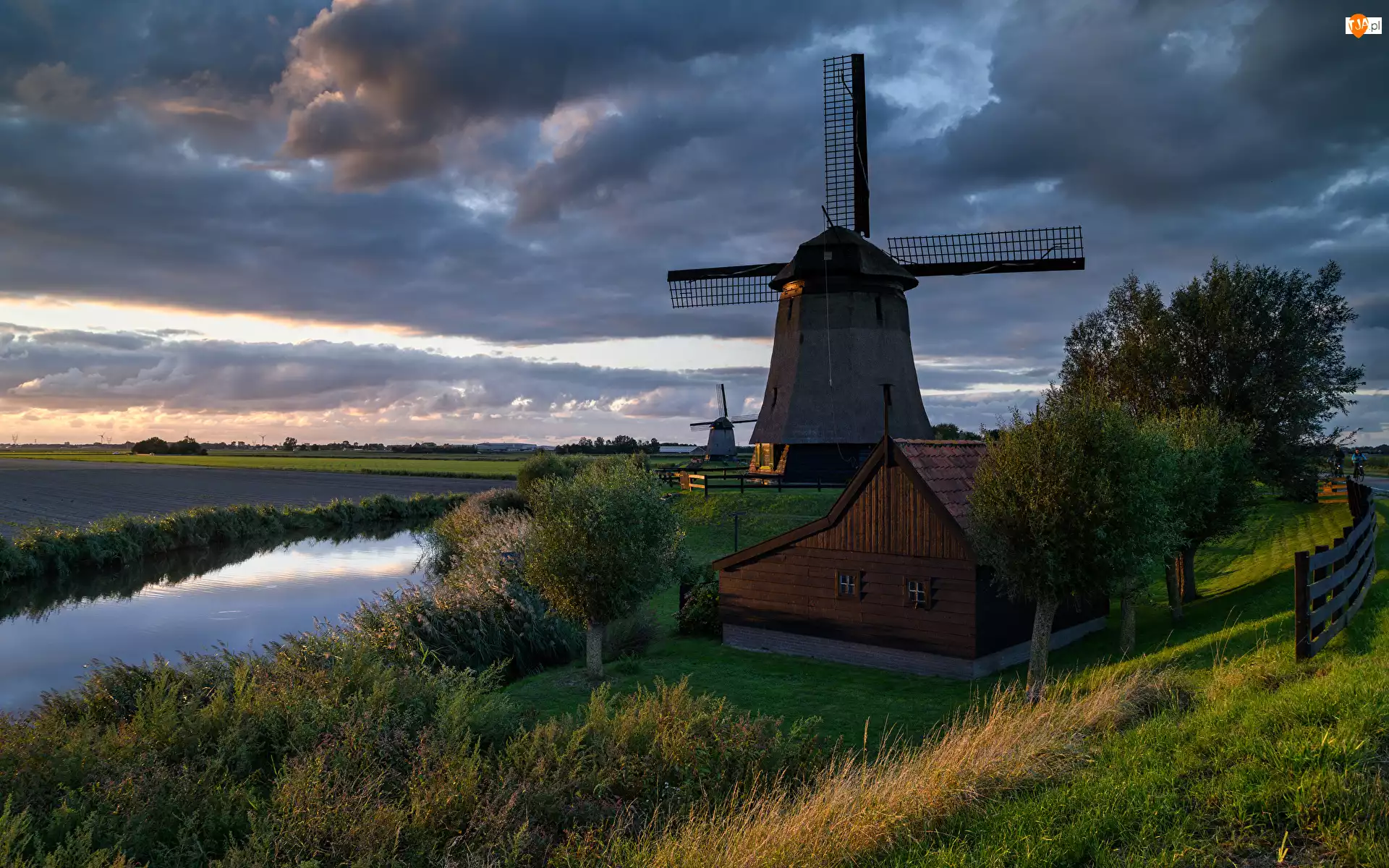Rzeka, Holandia, Wiatraki, Drzewa, Schermerhorn, Dom, Chmury, Gmina Alkmaar
