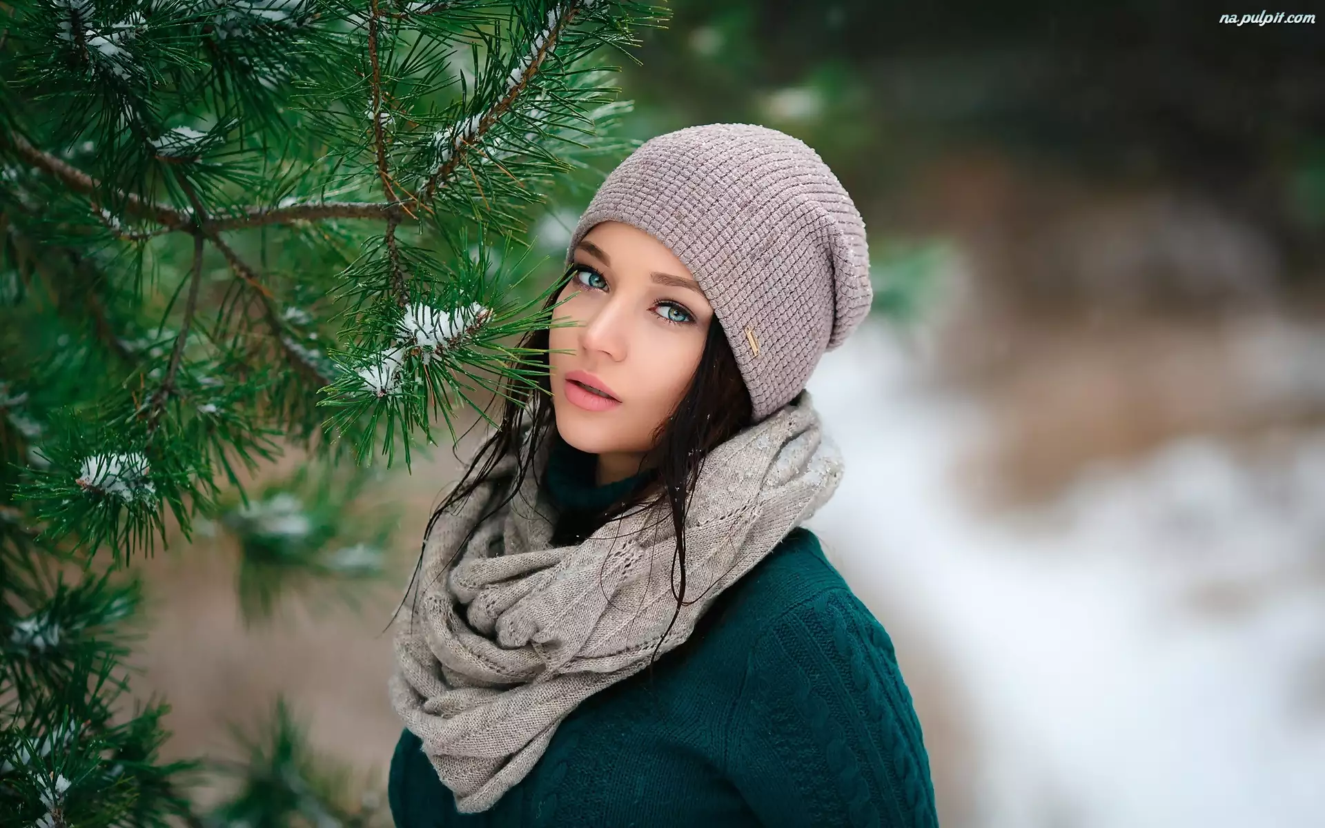 Modelka, Angelina Petrova, Sosna, Kobieta, Gałązki, Szal, Czapka